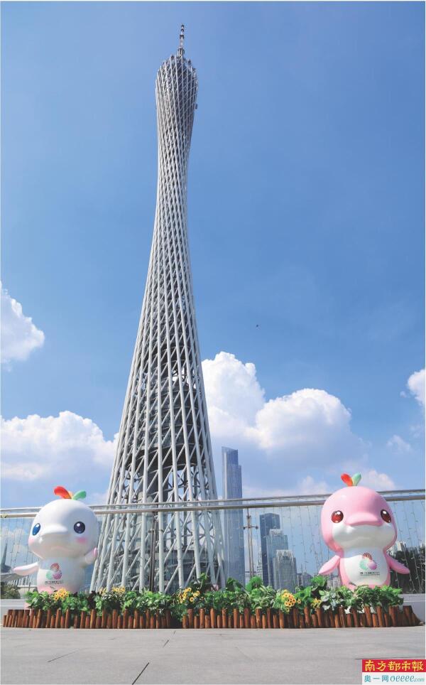 吉祥物“喜洋洋”“乐融融”与广州塔同框。通讯员 谢惠强 摄