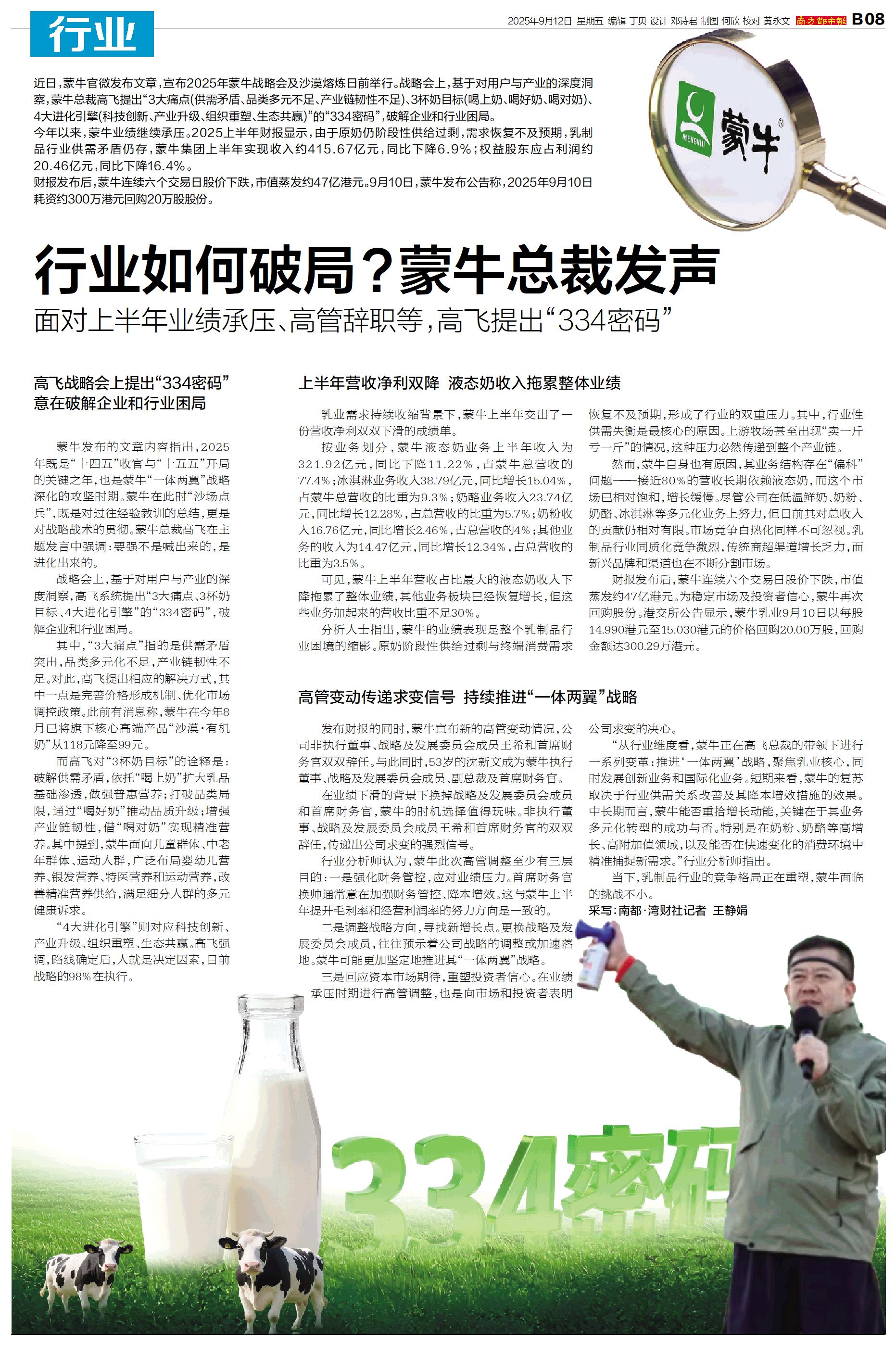 近日,蒙牛官微发布文章,宣布2025年蒙牛战略会及沙漠熔炼日前举行。战略会上,基于对用户与产业的深度洞察,蒙牛总裁高飞提出“3大痛点(供需矛盾、品类多元不足、产业链韧性不足)、3杯奶目标(喝上奶、