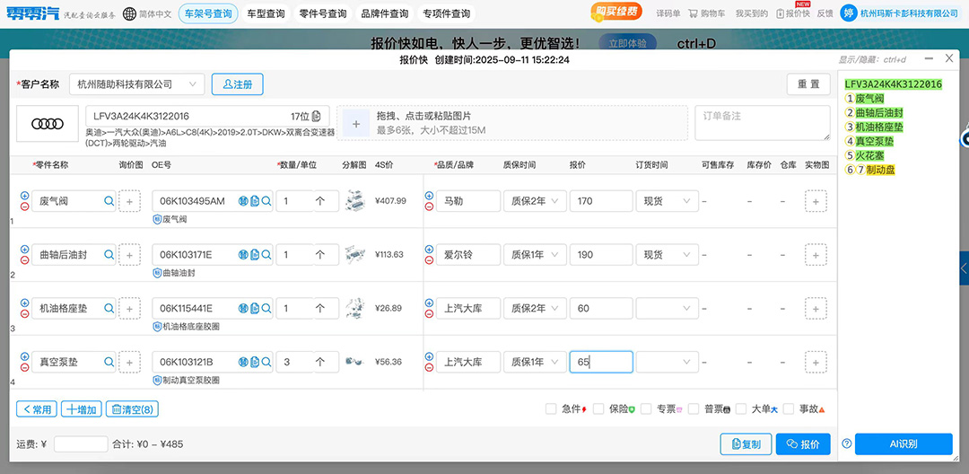 采访现场,佘邵镔向记者展示零零汽网页版的使用方法。用户通过文字输入、上传图片等方式,将车架号和所需的零部件告诉零零汽,报价结果马上生成,关于零部件的编码、库存状况、报价等信息都列了出来。值得一提的是,在AI的加持下,用户输入的需求可以如平时口头讲话时一般不严谨和随意,“机灵”的AI会作出进一步判断。此外,零零汽还具备库存管理和电商交易的功能,覆盖了汽车维修的更多流程。