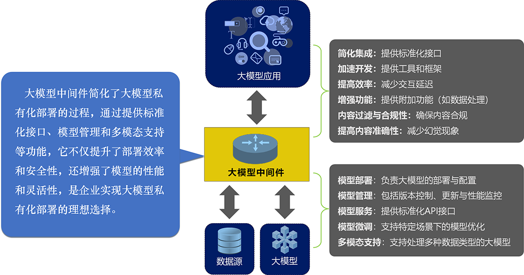 模型的出现让AI成为一种普惠技术,人人都可以方便地使用大模型来实现问答对话、翻译、绘图、写文案等功能。然而对企业来说,要让企业真正可以将大模型与企业业务结合,同时又不用担心数据安全和合规的风险,则需要一个桥梁——大模型中间件。