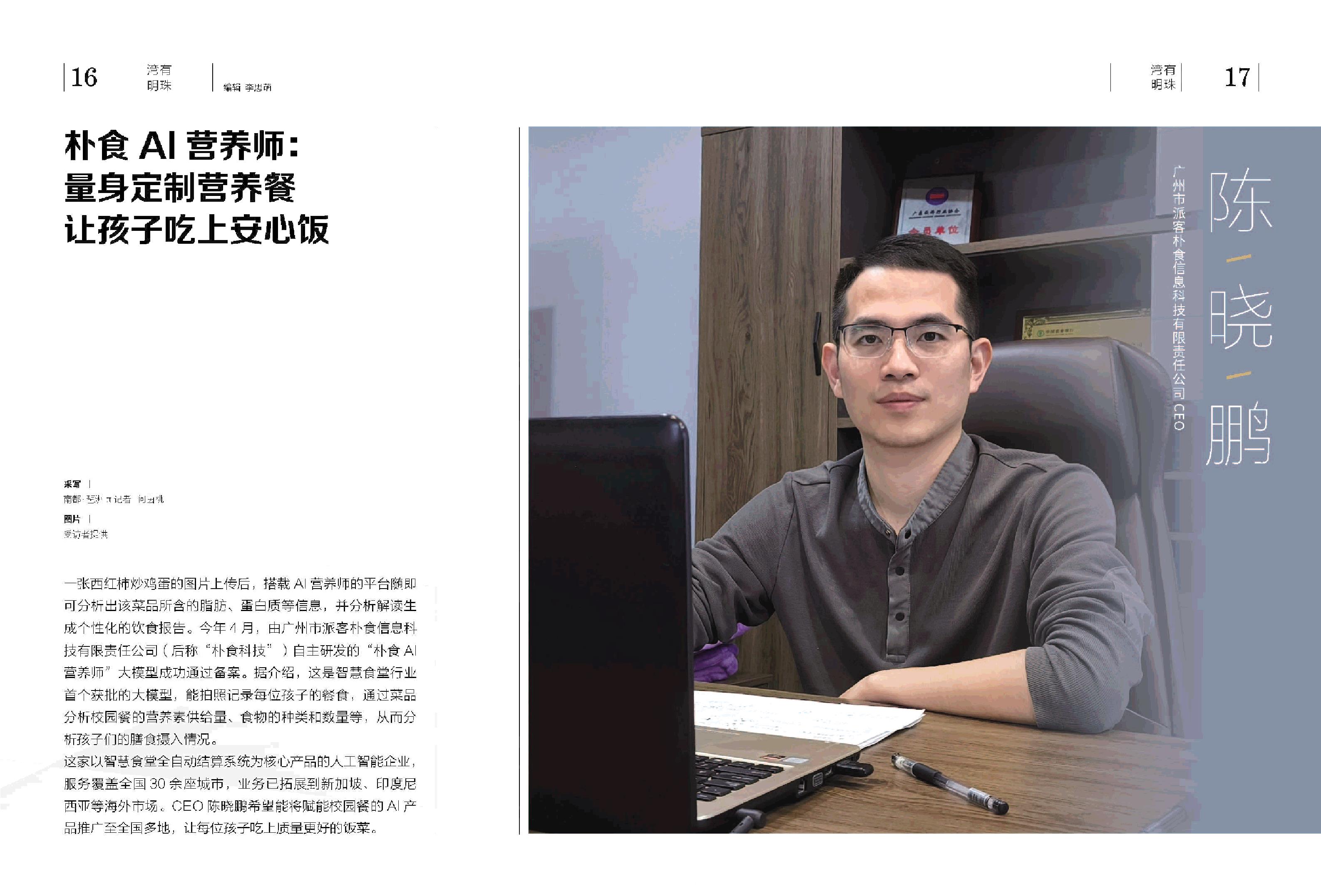 陈晓鹏 广州市派客朴食信息科技有限责任公司CEO 一张西红柿炒鸡蛋的图片上传后,搭载AI营养师的平台随即可分析出该菜品所含的脂肪、蛋白质等信息,并分析解读生成个性化的饮食报告。今年4月,由