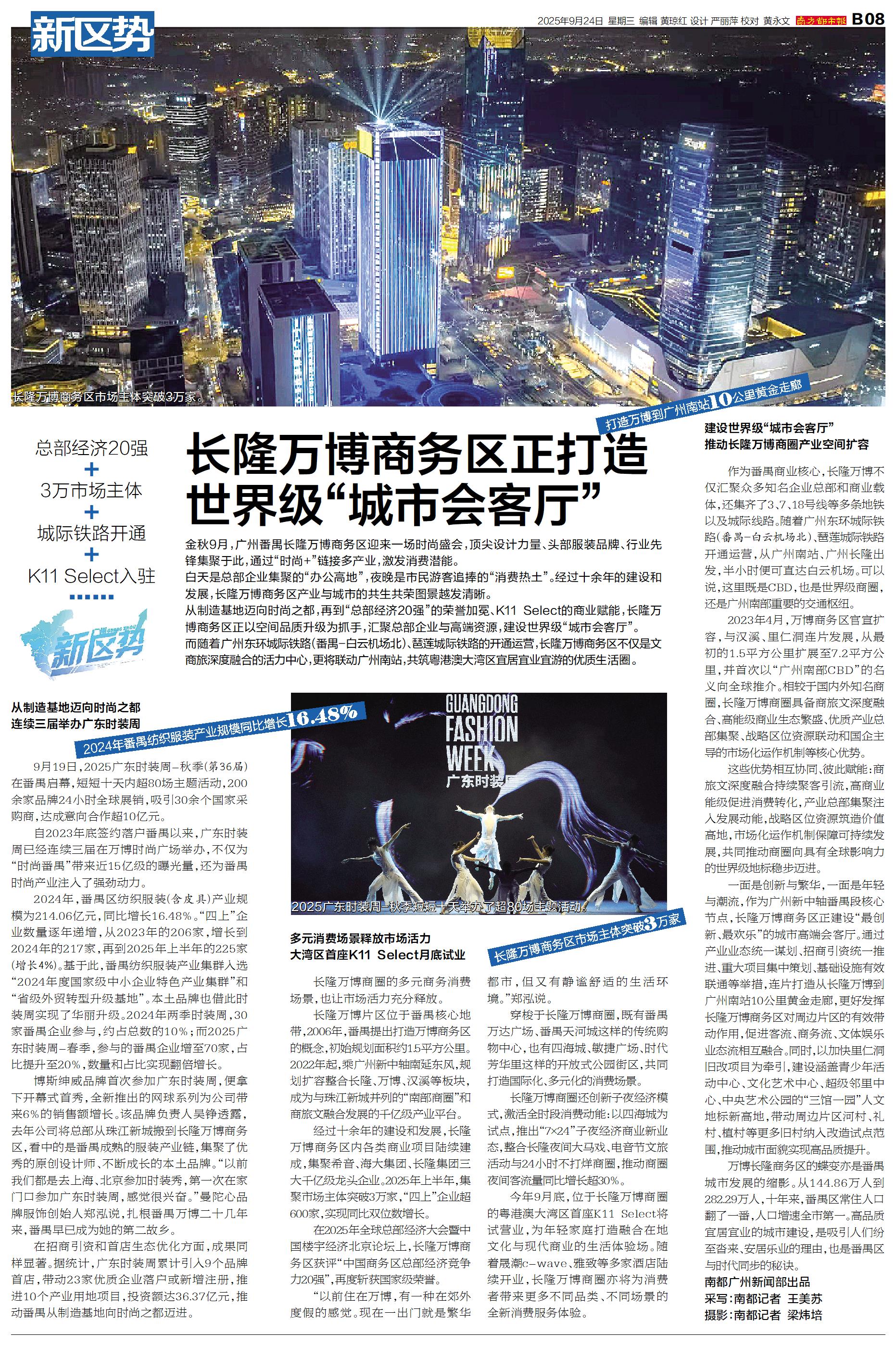 总部经济20强 + 3万市场主体 + 城际铁路开通 + K11 Select入驻 …… 金秋9月,广州番禺长隆万博商务区迎来一场时尚盛会,顶尖设计力量、头部服装品牌、行业先锋集聚于
