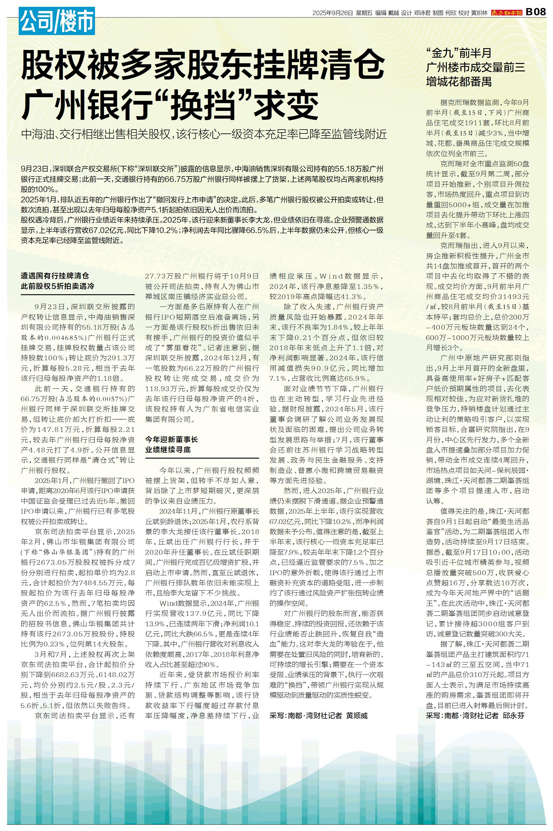 9月23日,深圳联合产权交易所(下称“深圳联交所”)披露的信息显示,中海油销售深圳有限公司持有的55.18万股广州银行正式挂牌交易;此前一天,交通银行持有的66.75万股广州银行同样被摆上了货架,上述两笔股权均占两家机构持股的100%。