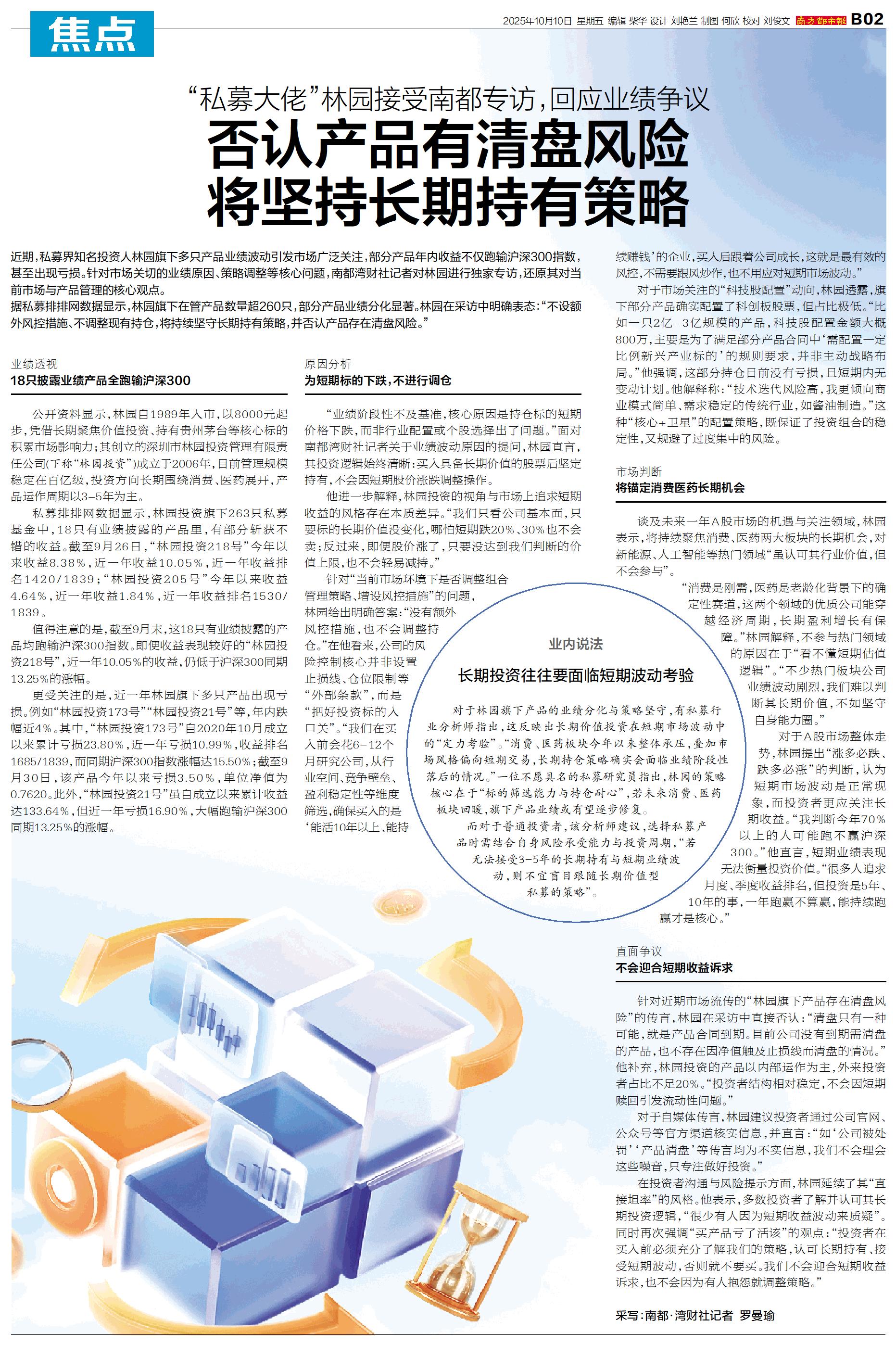 近期,私募界知名投资人林园旗下多只产品业绩波动引发市场广泛关注,部分产品年内收益不仅跑输沪深300指数,甚至出现亏损。针对市场关切的业绩原因、策略调整等核心问题,南都湾财社记者对林园进行独家专访,