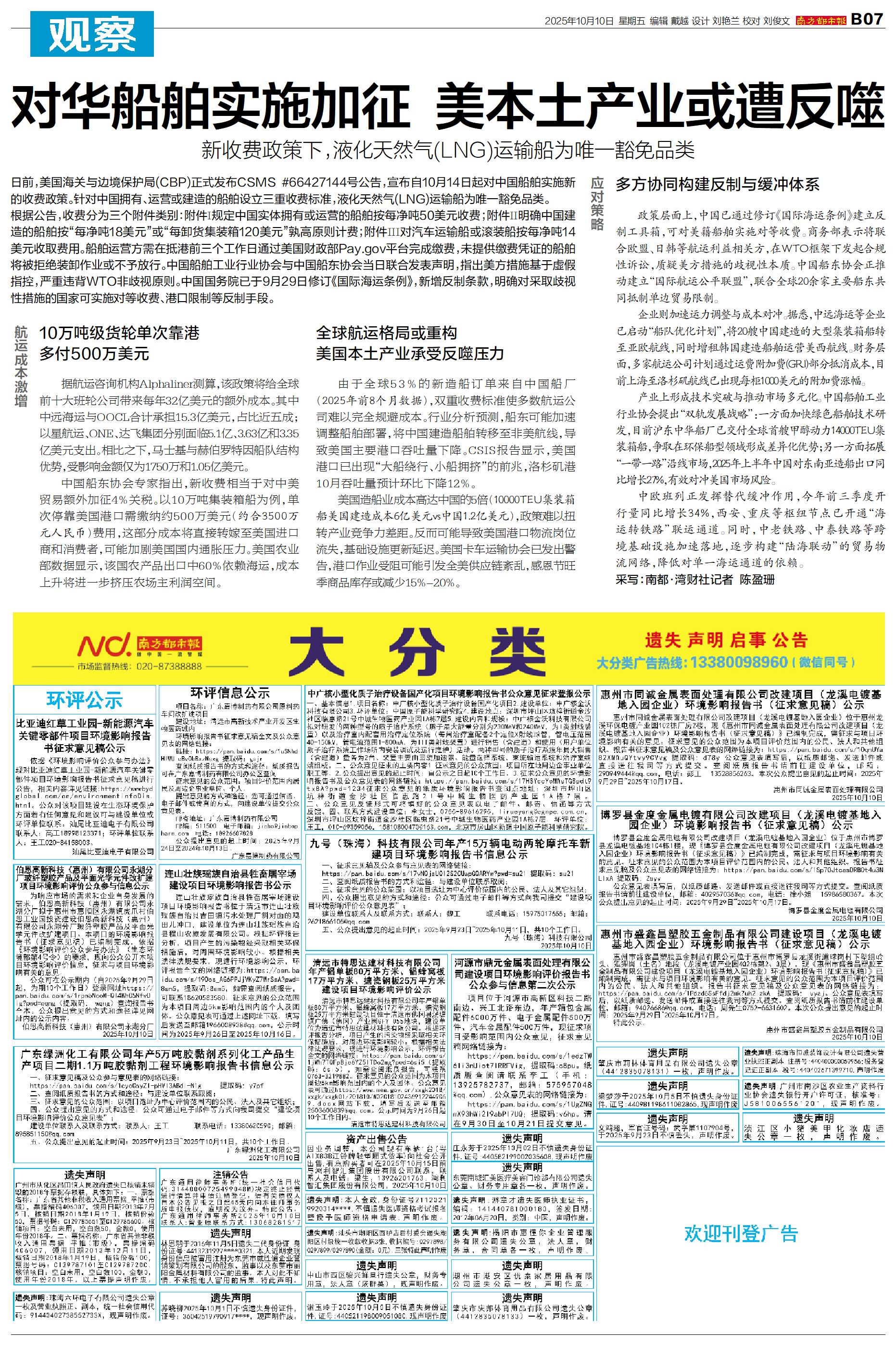 日前,美国海关与边境保护局(CBP)正式发布CSMS #66427144号公告,宣布自10月14日起对中国船舶实施新的收费政策。针对中国拥有、运营或建造的船舶设立三重收费标准,液化天然气(LNG)
