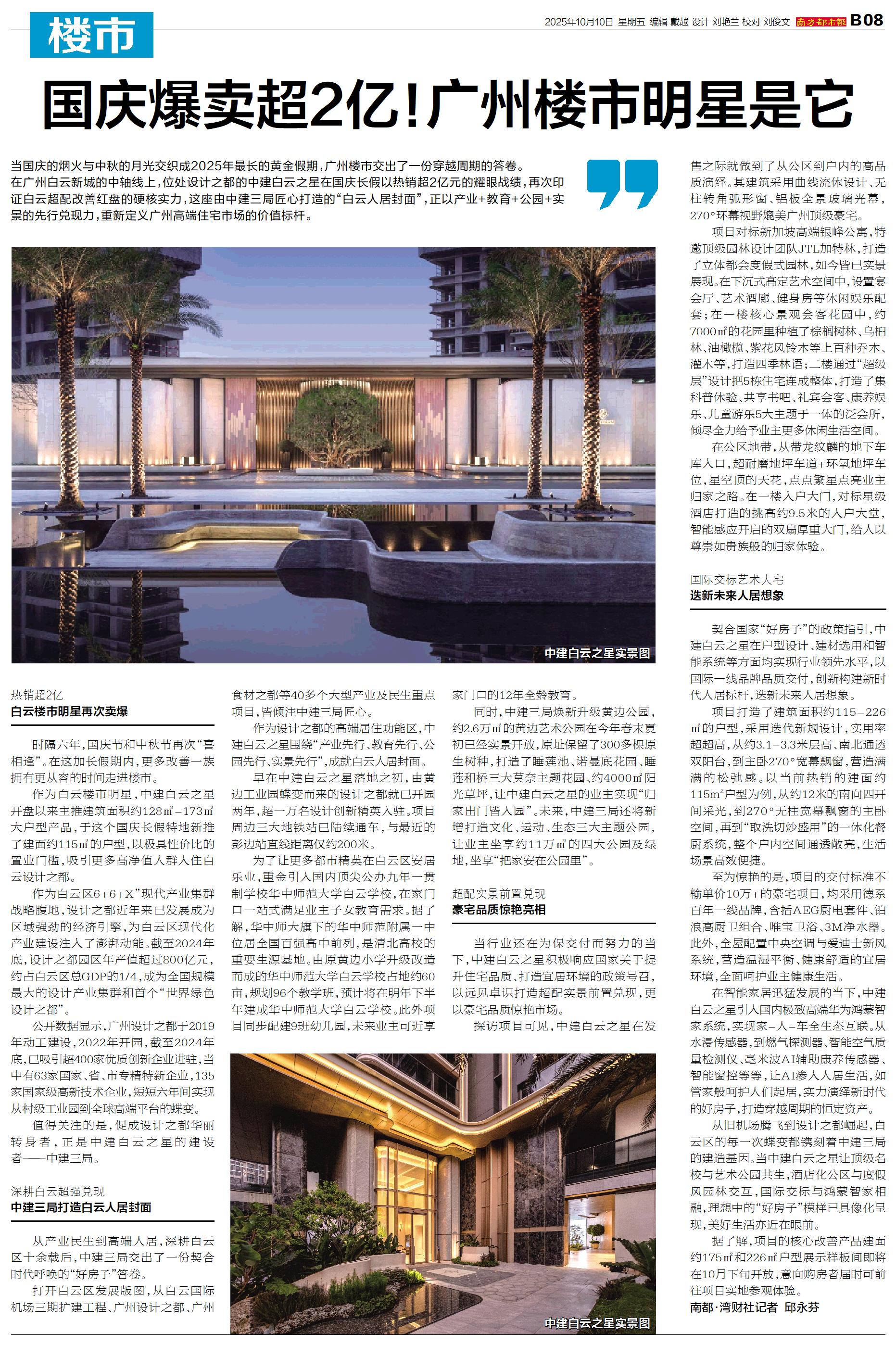 当国庆的烟火与中秋的月光交织成2025年最长的黄金假期,广州楼市交出了一份穿越周期的答卷。 在广州白云新城的中轴线上,位处设计之都的中建白云之星在国庆长假以热销超2亿元的耀眼战绩,再次印证白云超