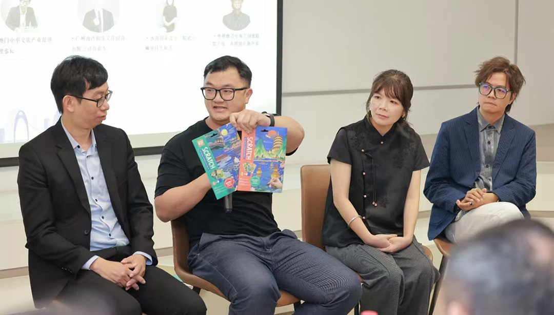 在2024年粤港澳大湾区文化产业创新交流会暨“湾社通·文创汇客厅”揭牌仪式活动上,江志成向嘉宾们推介公司出品的大湾区专属文创。受访者供图