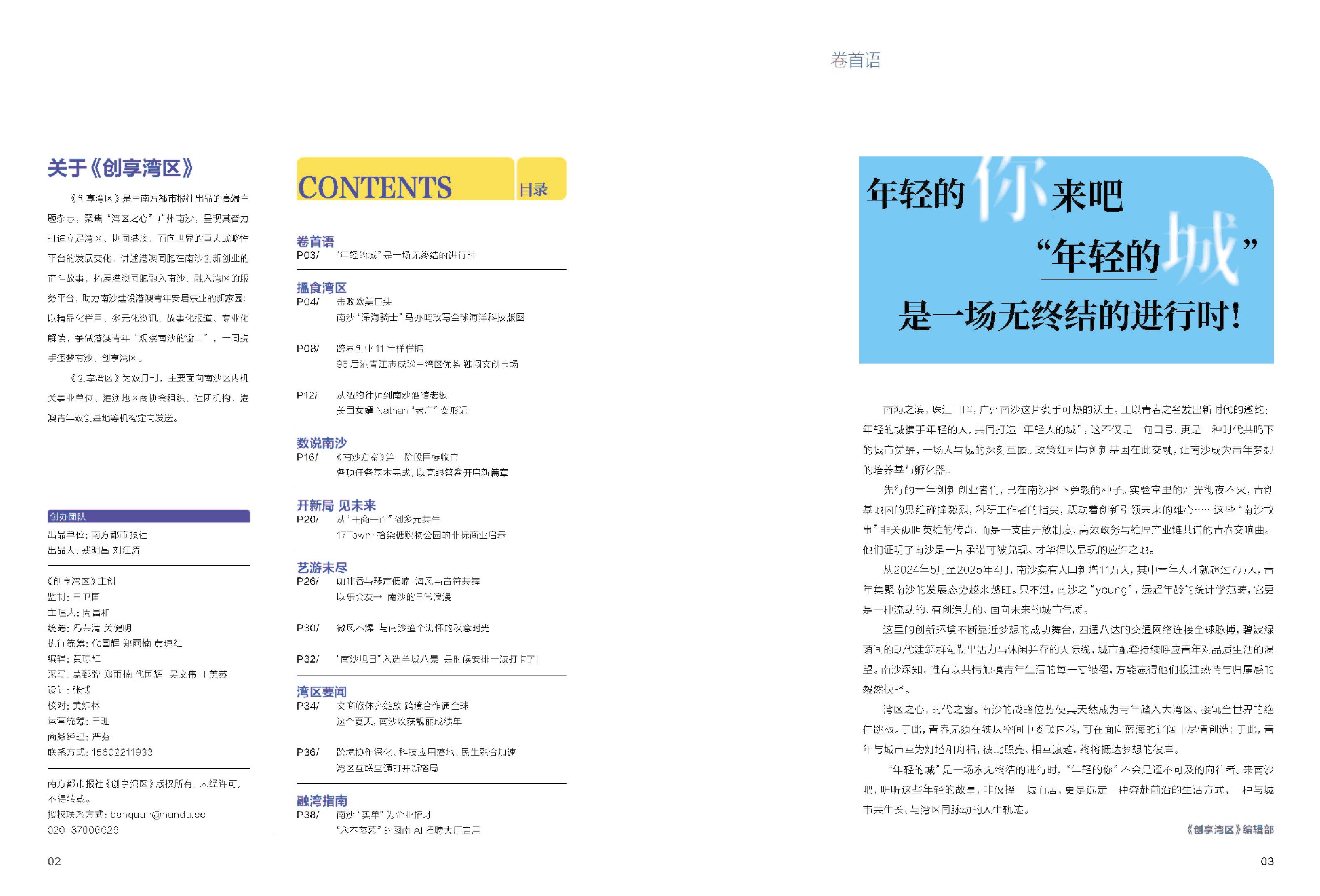 卷首语 P03/ “年轻的城”是一场无终结的进行时! 搵食湾区 P04/ 击败欧美巨头 南沙“深海骑士”马亦鸣改写全球海洋科技版图 P08/ 跨界创业11年样样掂 95后