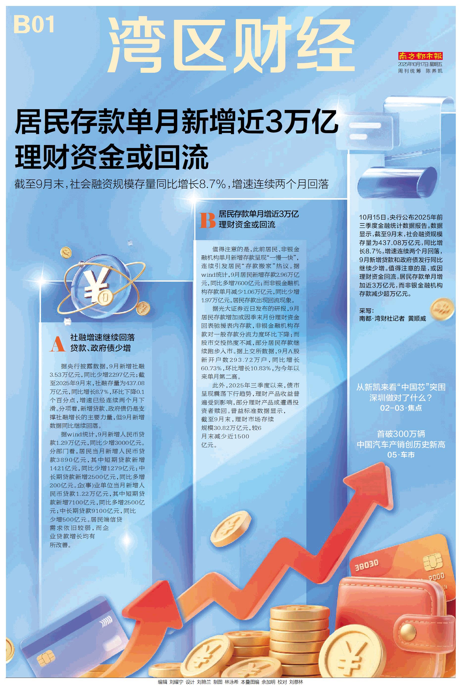 10月15日,央行公布2025年前三季度金融统计数据报告。数据显示,截至9月末,社会融资规模存量为437.08万亿元,同比增长8.7%,增速连续两个月回落,9月新增贷款和政府债发行同比继续少增。值