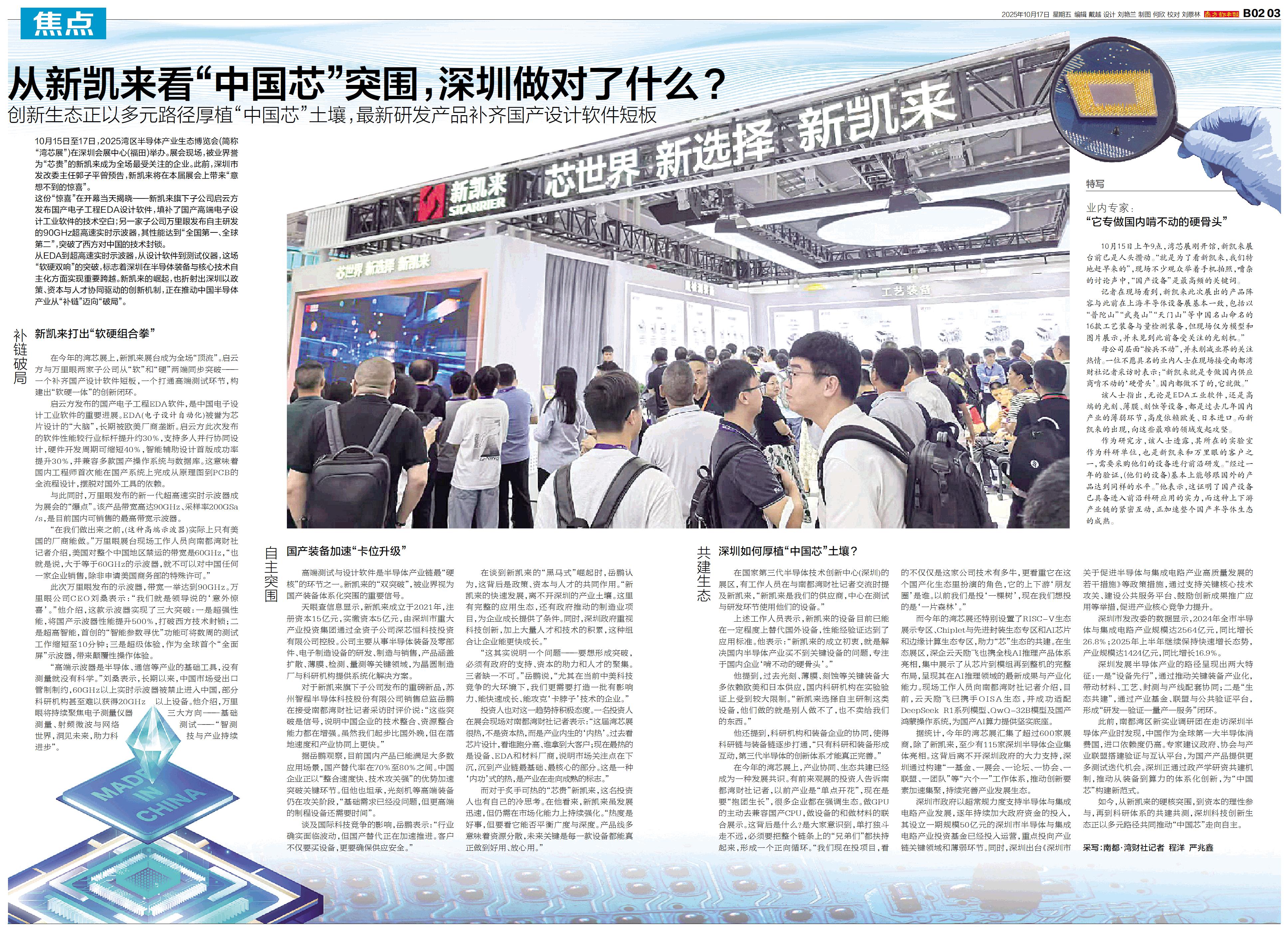 10月15日至17日,2025湾区半导体产业生态博览会(简称“湾芯展”)在深圳会展中心(福田)举办。展会现场,被业界誉为“芯贵”的新凯来成为全场最受关注的企业。此前,深圳市发改委主任郭子平曾预告,