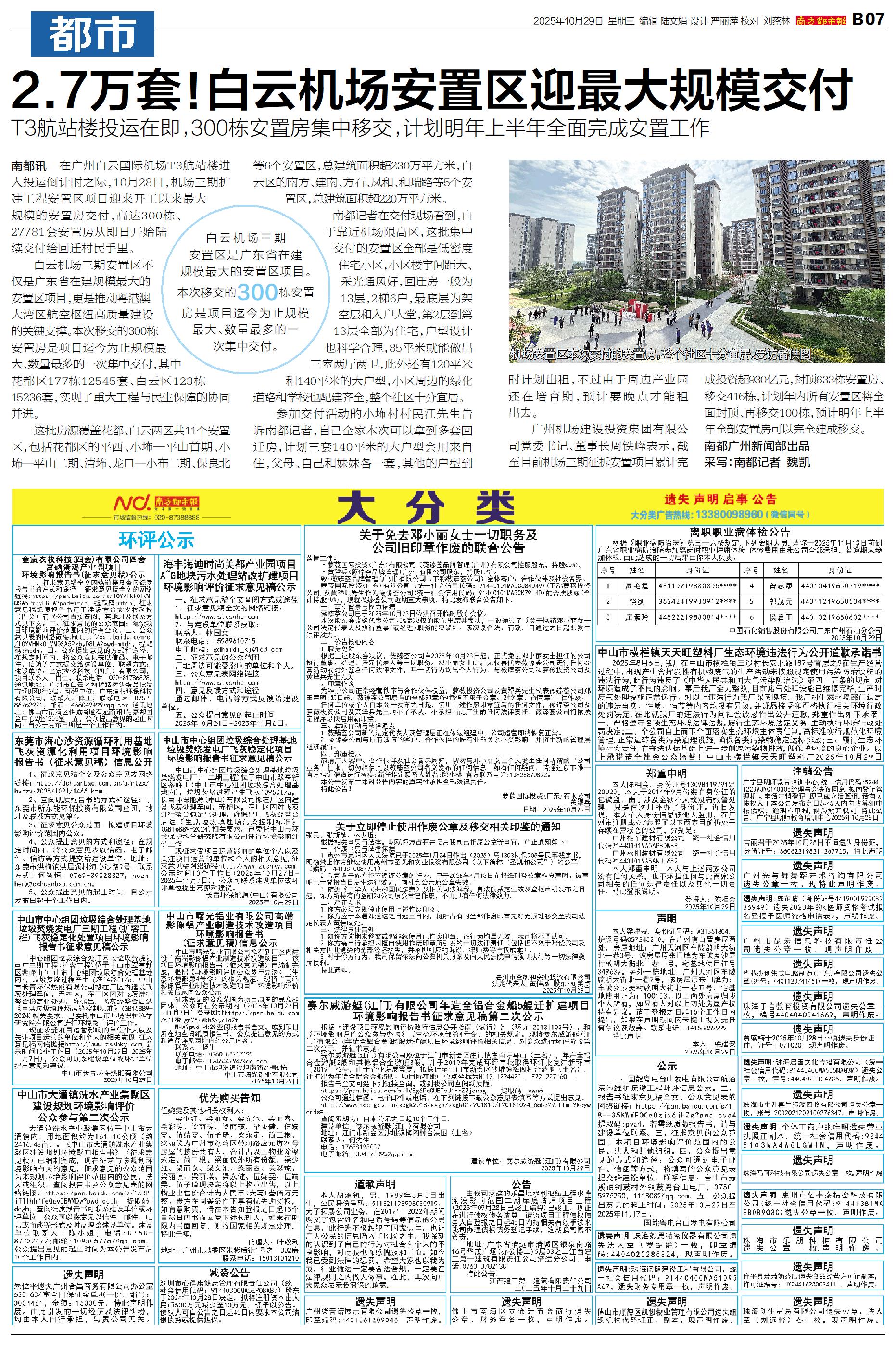 南都讯 在广州白云国际机场T3航站楼进入投运倒计时之际,10月28日,机场三期扩建工程安置区项目迎来开工以来最大规模的安置房交付,高达300栋、27781套安置房从即日开始陆续交付给回迁村民手里。