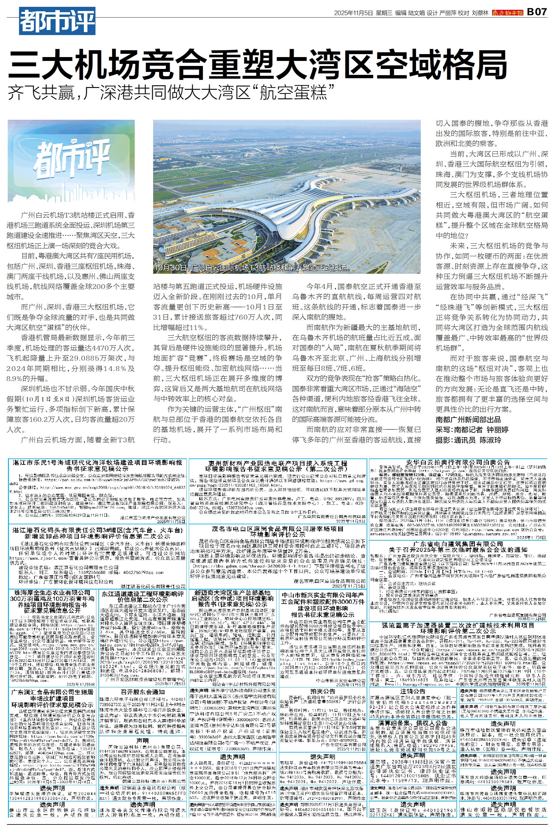广州白云机场T3航站楼正式启用、香港机场三跑道系统全面投运、深圳机场第三跑道建设全速推进……聚焦湾区天空,三大枢纽机场正上演一场深刻的竞合大戏。 目前,粤港澳大湾区共有7座民用机场,包括广州、深