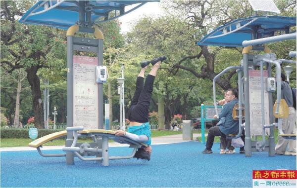 11月7日下午,在位于越秀区的二沙岛体育公园里,65岁的李女士正做着一些高难度的拉伸动作:借助现场器械,将头下压到脚跟上,进行倒立。在此运动健身有15年,她非常熟悉场地的变化,包括近期因为十五运会举办而进行的一些改造提升。
