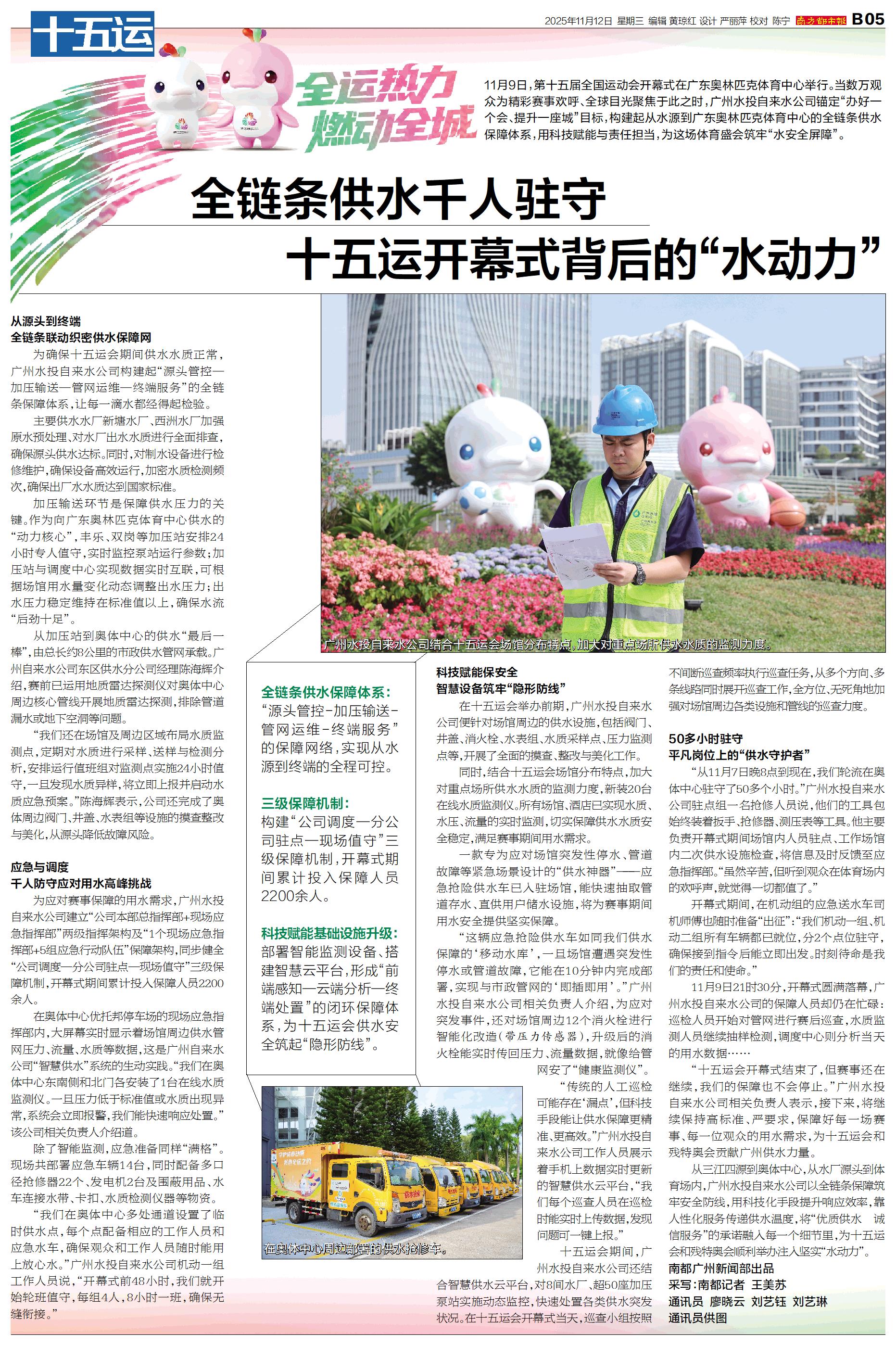 11月9日,第十五届全国运动会开幕式在广东奥林匹克体育中心举行。当数万观众为精彩赛事欢呼、全球目光聚焦于此之时,广州水投自来水公司锚定“办好一个会、提升一座城”目标,构建起从水源到广东奥林匹克体育