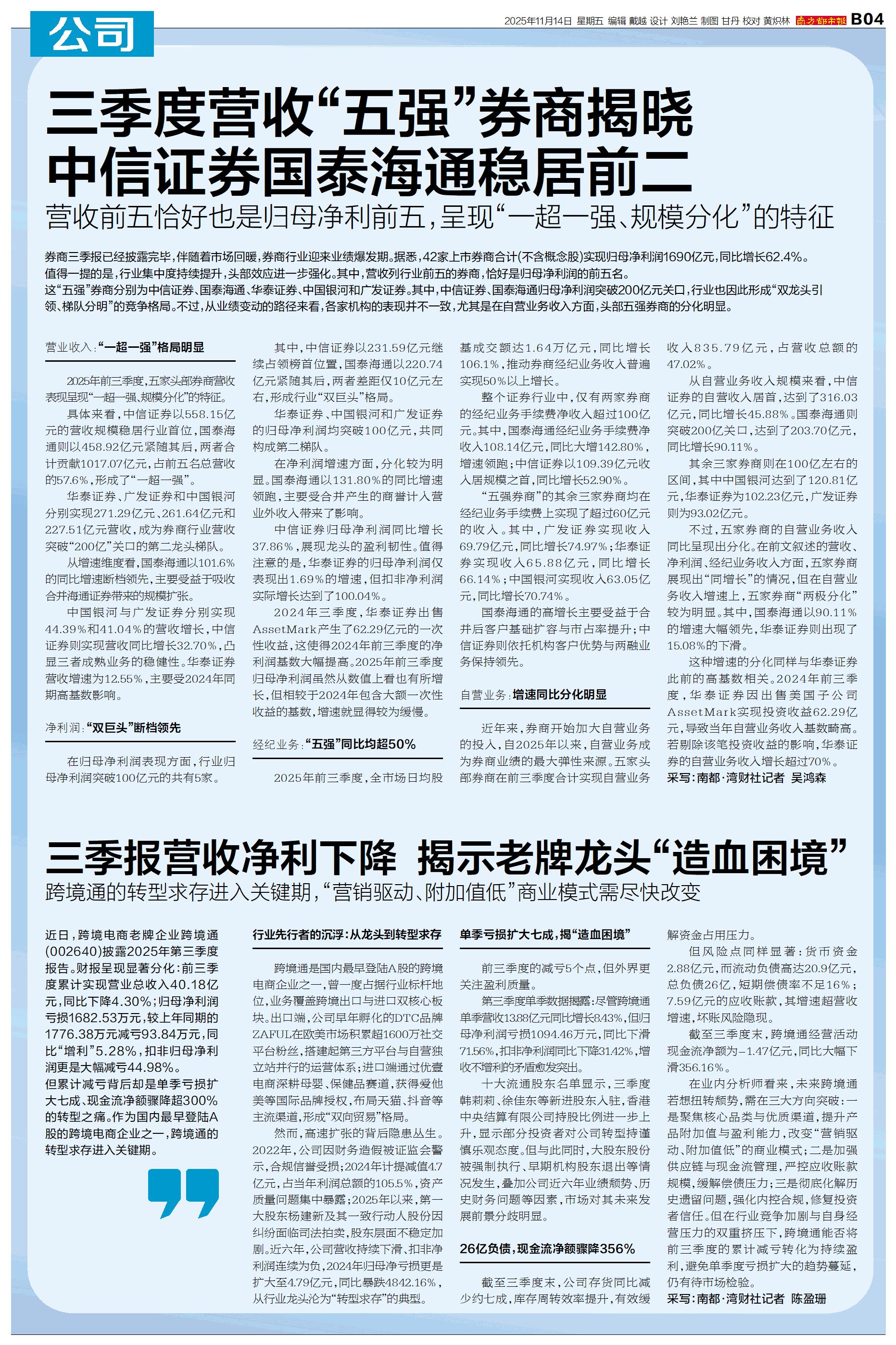 三季度营收“五强”券商揭晓 中信证券国泰海通稳居前二