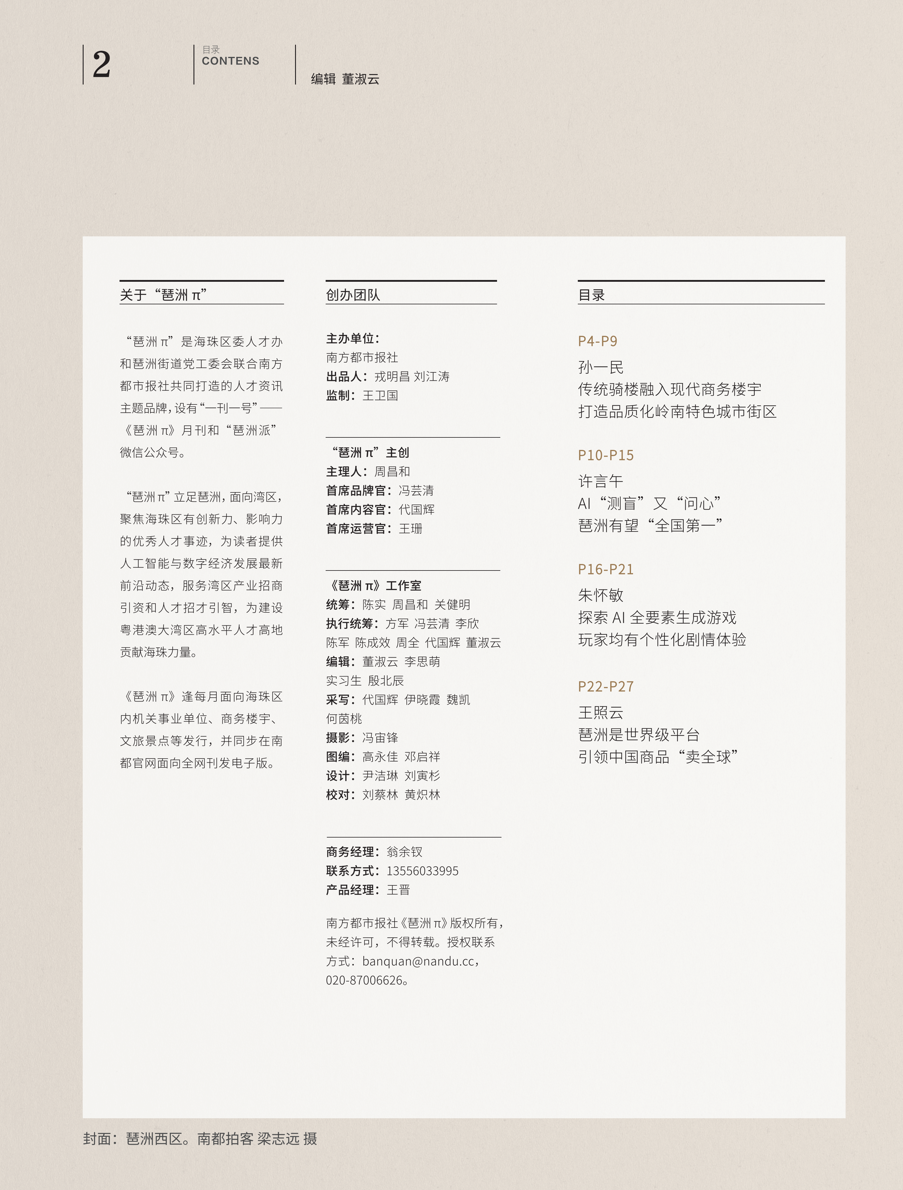 本期《琶洲π》以“琶洲之星”的名义,采访了在琶洲具有代表性的产业中的典型人物。我们选取了四个角度,来讲述琶洲“崛起”过程中,个人成长与区域发展同频共振的故事。这四个角度分别是:规划、会展、人工智能和文娱。