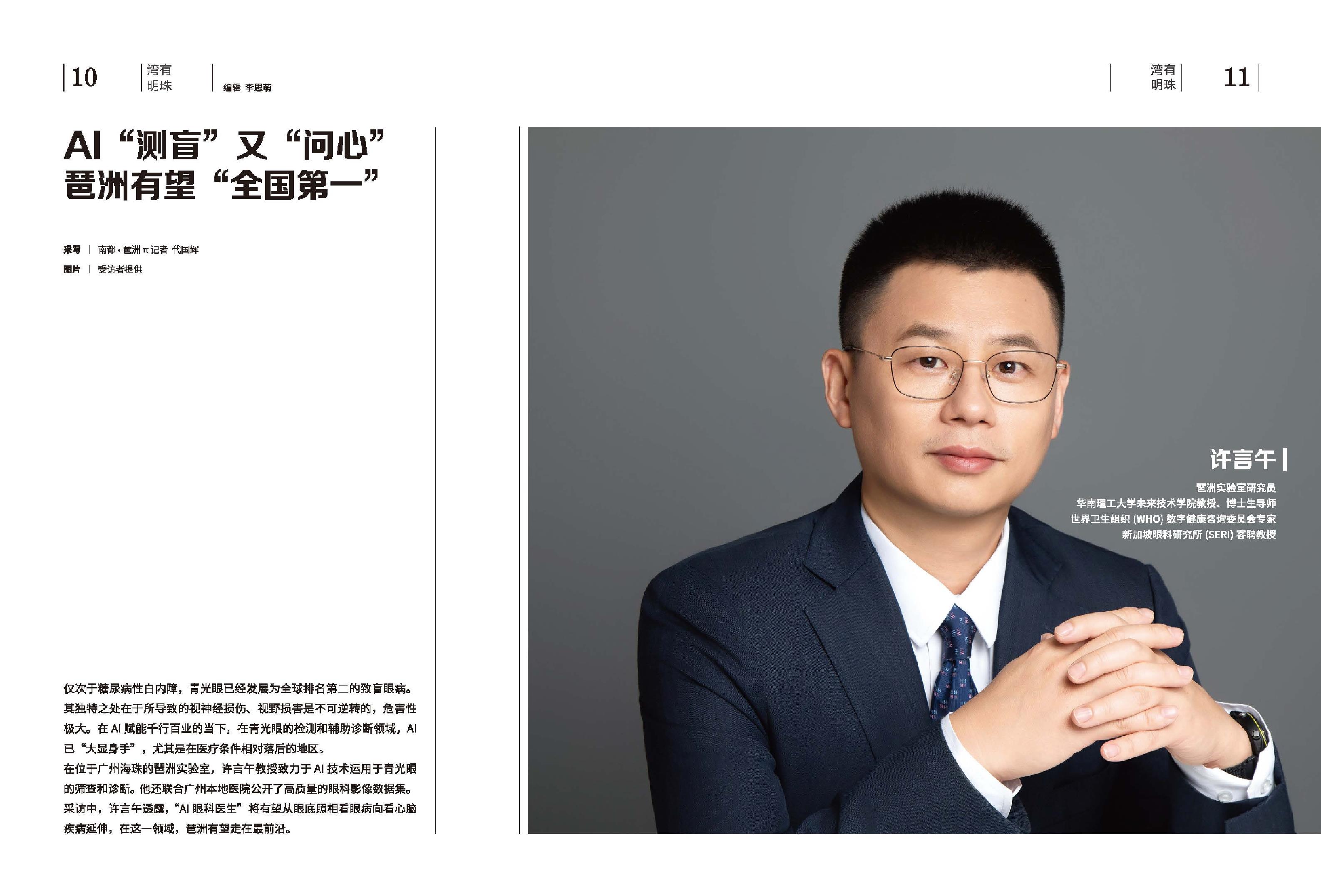 人物名片: 许言午,琶洲实验室研究员,华南理工大学未来技术学院教授、博士生导师,世界卫生组织(WHO)数字健康咨询委员会专家,新加坡眼科研究所(SERI)客聘教授