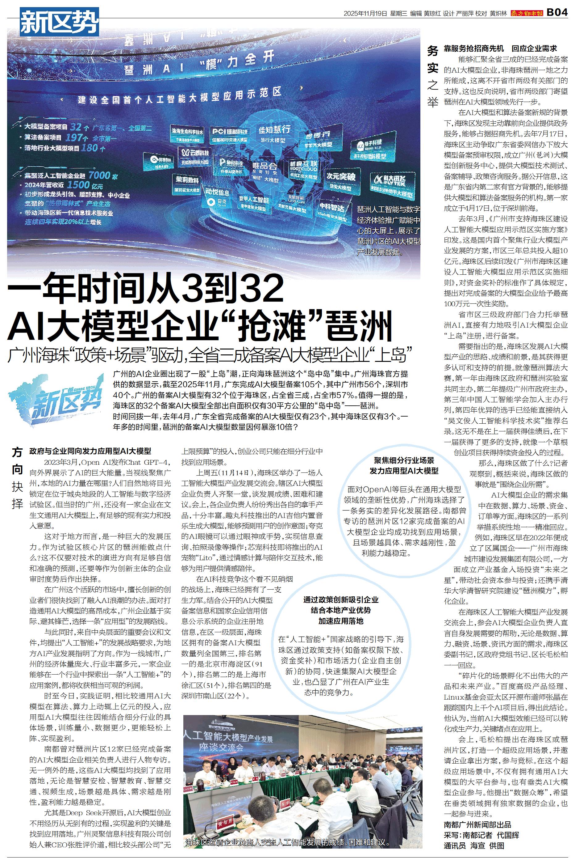 广州的AI企业圈出现了一股“上岛”潮,正向海珠琶洲这个“岛中岛”集中。广州海珠官方提供的数据显示,截至2025年11月,广东完成AI大模型备案105个,其中广州市56个,深圳市40个。广州的备案A
