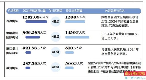 刚刚过去的11月20日,惠州机场年旅客吞吐量刷新纪录,突破300万人次;东翼的揭阳潮汕国际机场2024年全年旅客吞吐量达866.6万人次,创历史新高,今年更是有望冲刺千万客流;西翼的湛江吴川国际机场则以4E干线机场为目标,迈入提质扩容新阶段……珠海机场、揭阳潮汕国际机场、湛江吴川国际机场、惠州机场——这四大枢纽,正以功能互补、错位发展之姿,共同启动区域经济协同的新引擎。它们能否真正盘活全局,推动粤东西北与珠三角核心区实现更深层次的“共振”,值得拭目以待。