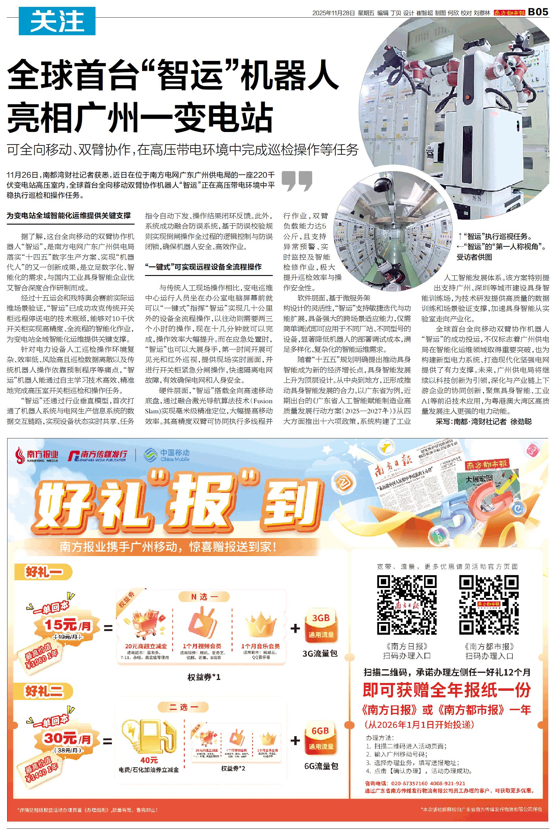 11月26日,南都湾财社记者获悉,近日在位于南方电网广东广州供电局的一座220千伏变电站高压室内,全球首台全向移动双臂协作机器人“智运”正在高压带电环境中平稳执行巡检和操作任务。 为变电站全域智