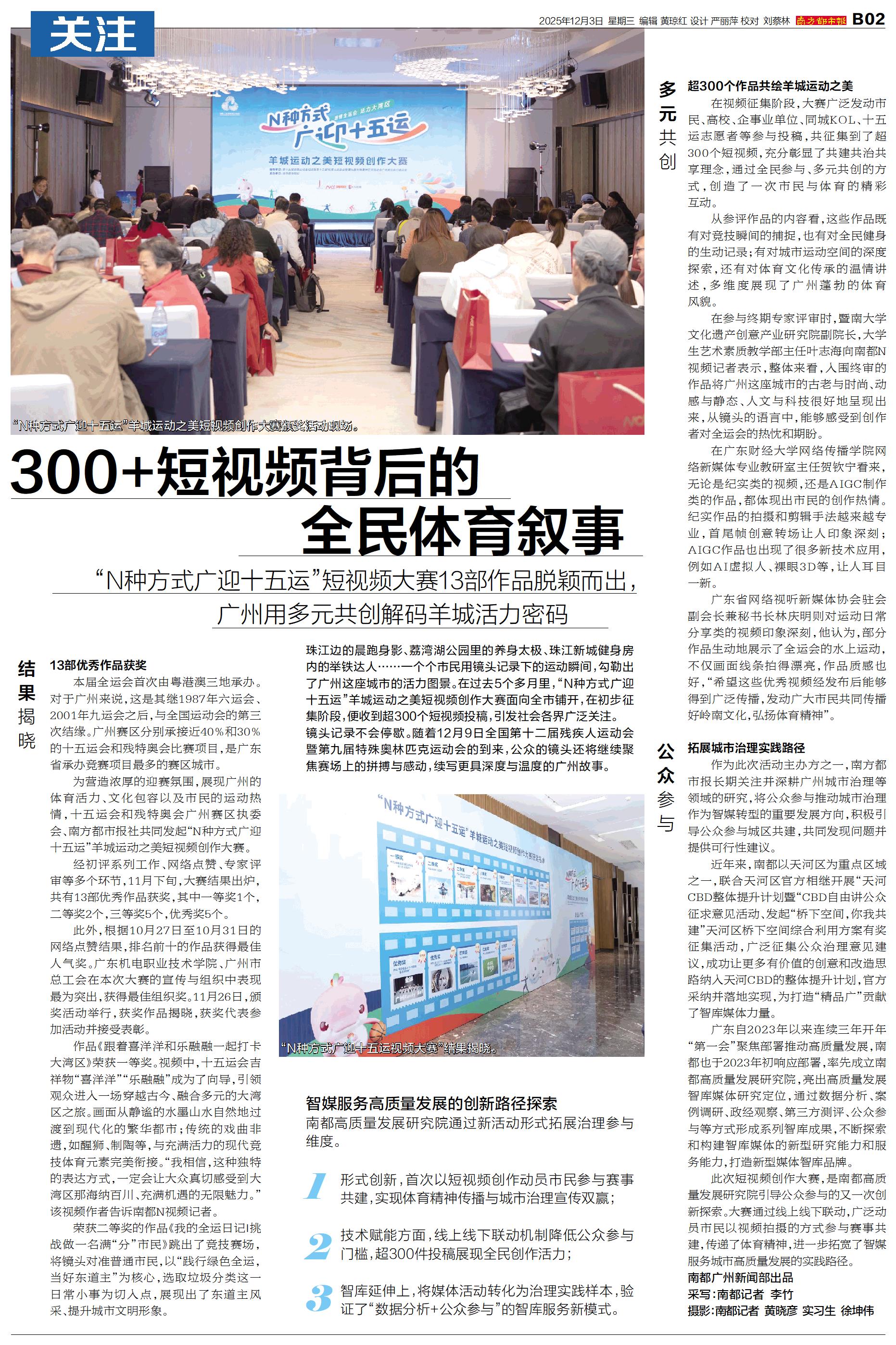 珠江边的晨跑身影、荔湾湖公园里的养身太极、珠江新城健身房内的举铁达人……一个个市民用镜头记录下的运动瞬间,勾勒出了广州这座城市的活力图景。在过去5个多月里,“N种方式广迎十五运”羊城运动之美短视频