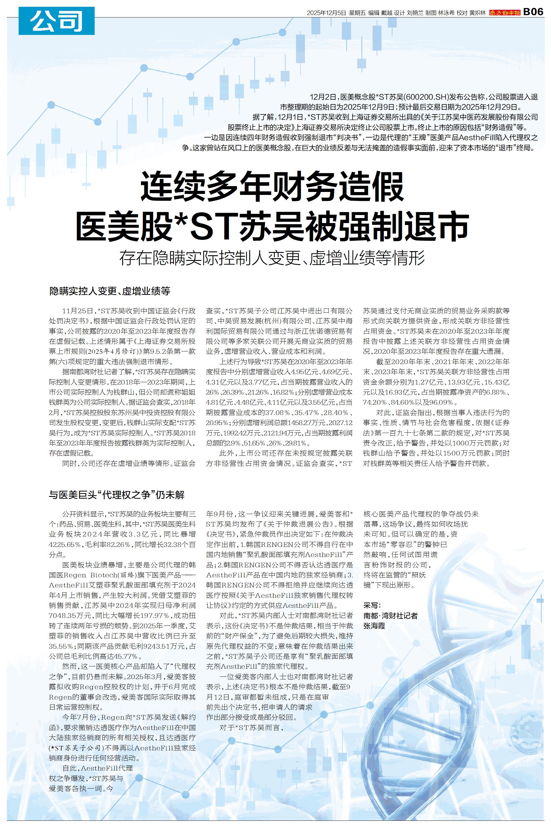 连续多年财务造假 医美股*ST苏吴被强制退市