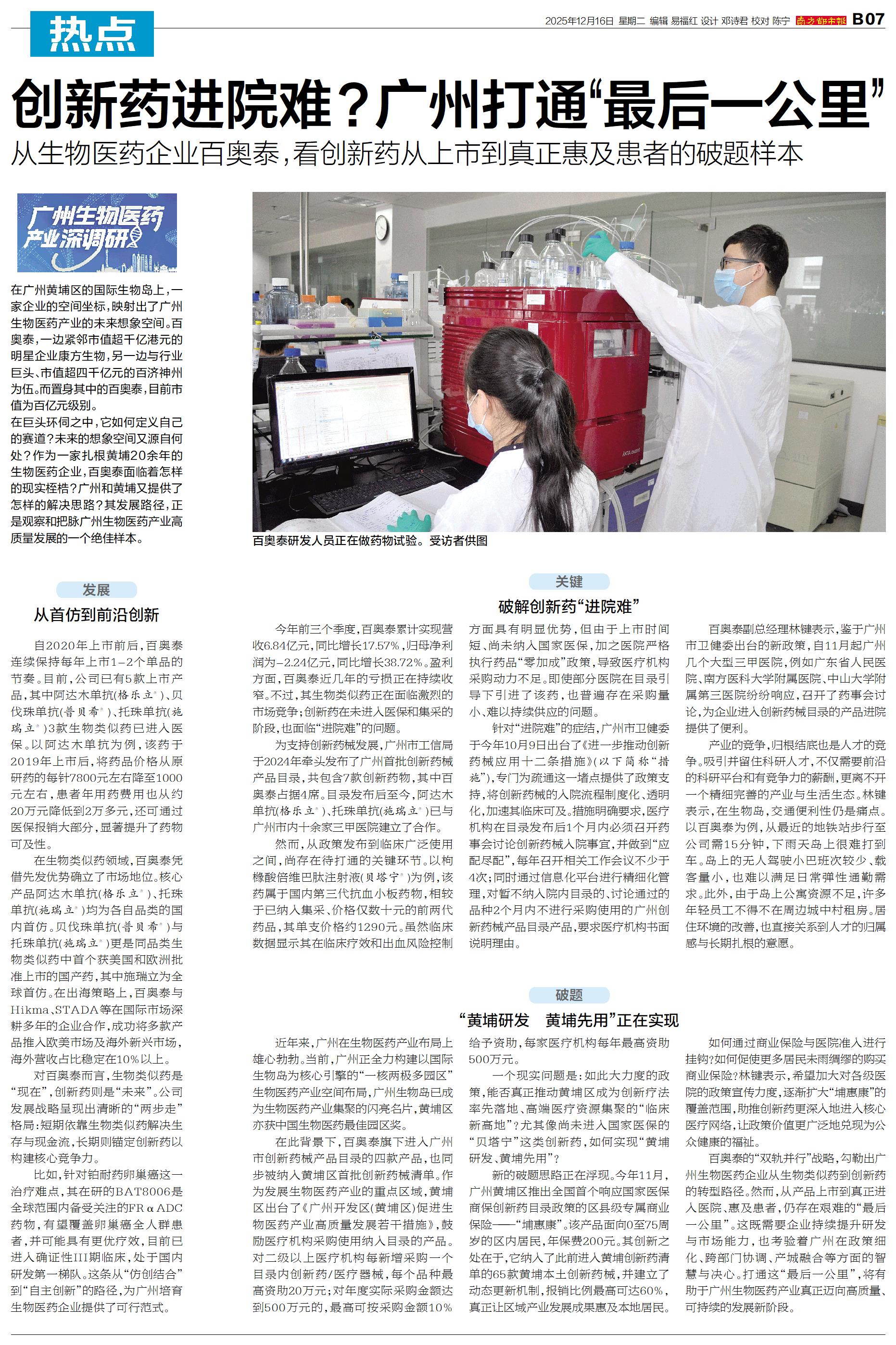 在广州黄埔区的国际生物岛上,一家企业的空间坐标,映射出了广州生物医药产业的未来想象空间。百奥泰,一边紧邻市值超千亿港元的明星企业康方生物,另一边与行业巨头、市值超四千亿元的百济神州为伍。而置身其中