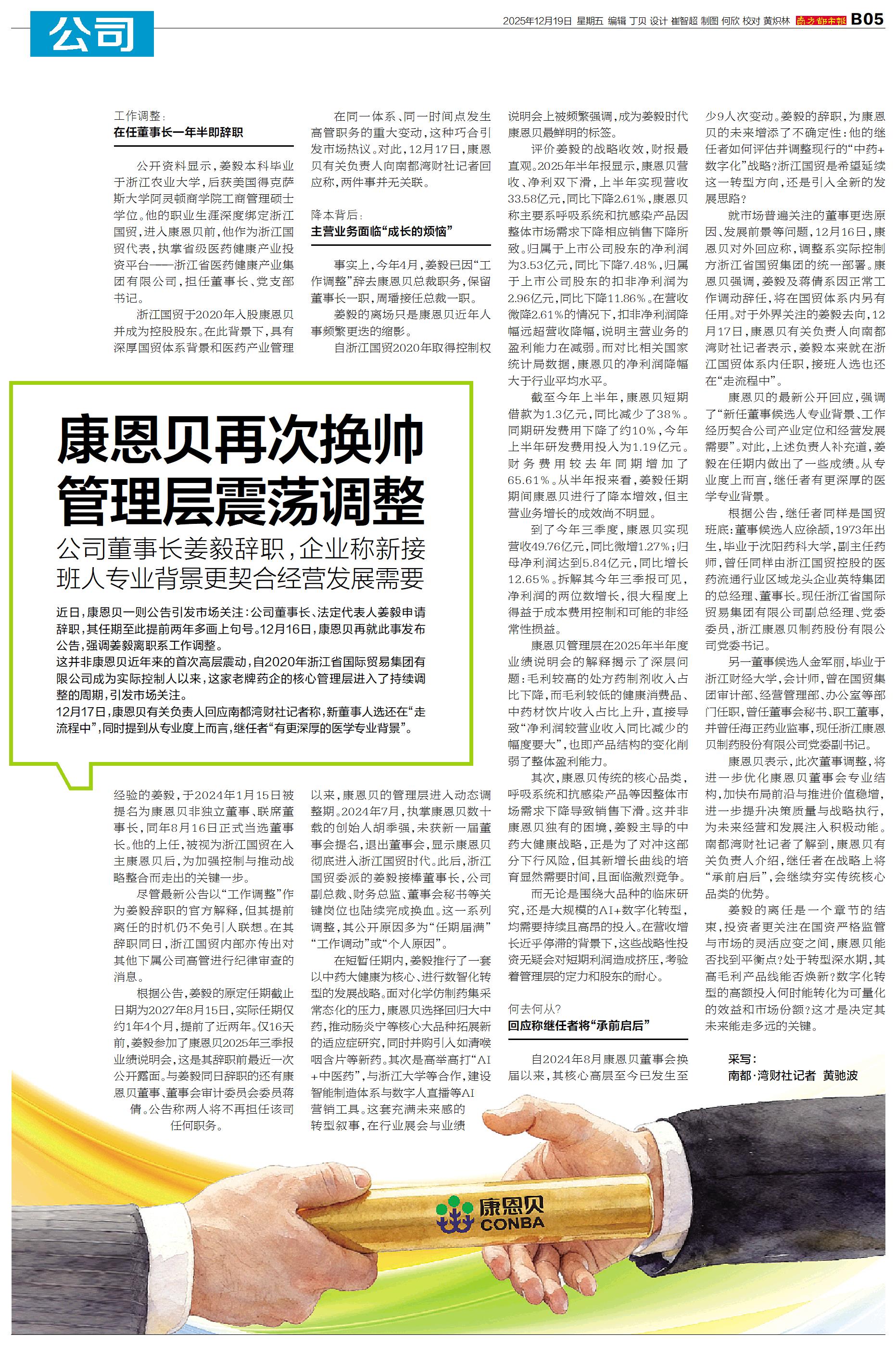 近日,康恩贝一则公告引发市场关注:公司董事长、法定代表人姜毅申请辞职,其任期至此提前两年多画上句号。12月16日,康恩贝再就此事发布公告,强调姜毅离职系工作调整。 这并非康恩贝近年来的首次高层震