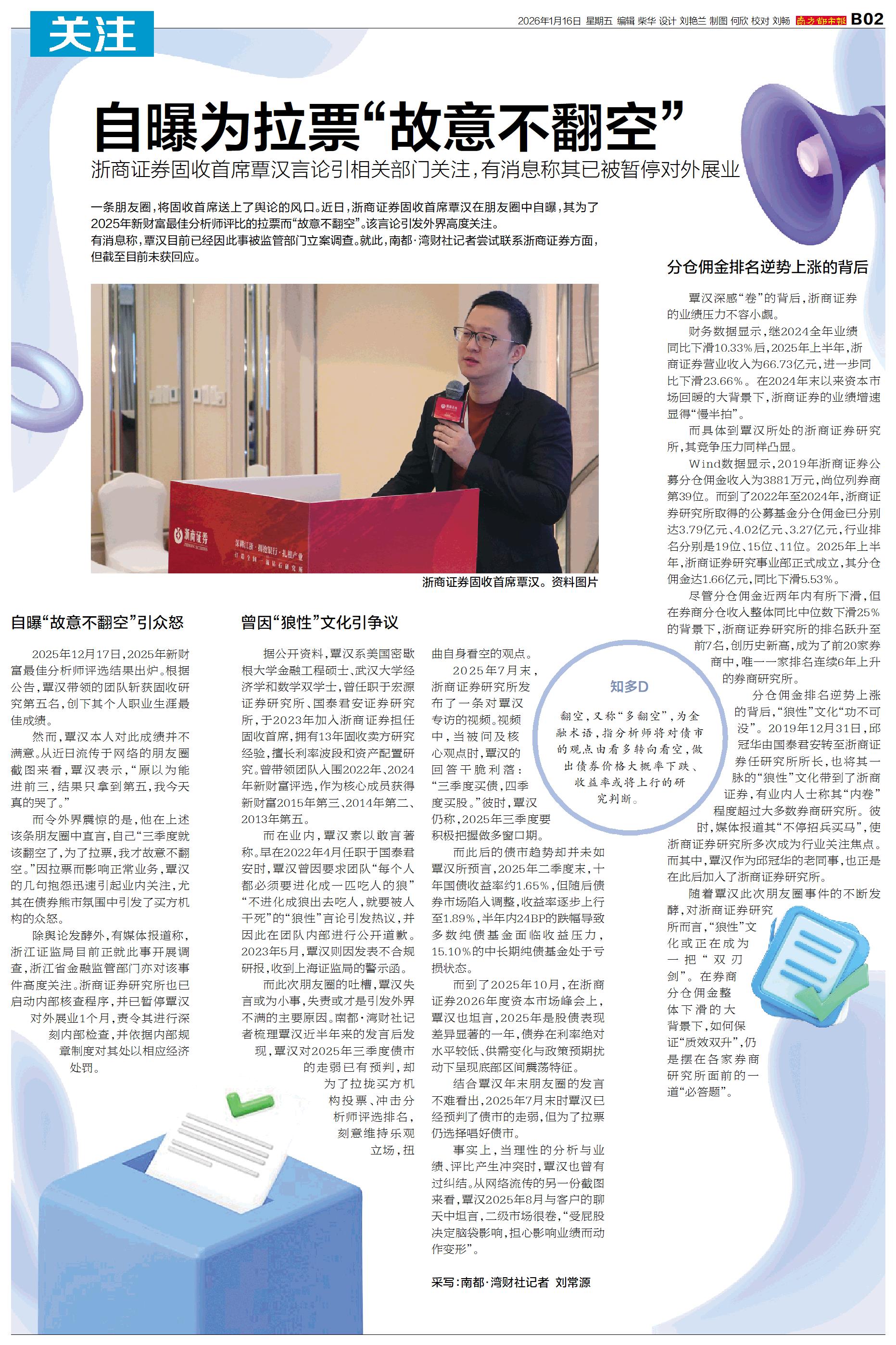 一条朋友圈,将固收首席送上了舆论的风口。近日,浙商证券固收首席覃汉在朋友圈中自曝,其为了2025年新财富最佳分析师评比的拉票而“故意不翻空”。该言论引发外界高度关注。 有消息称,覃汉目前已经因此