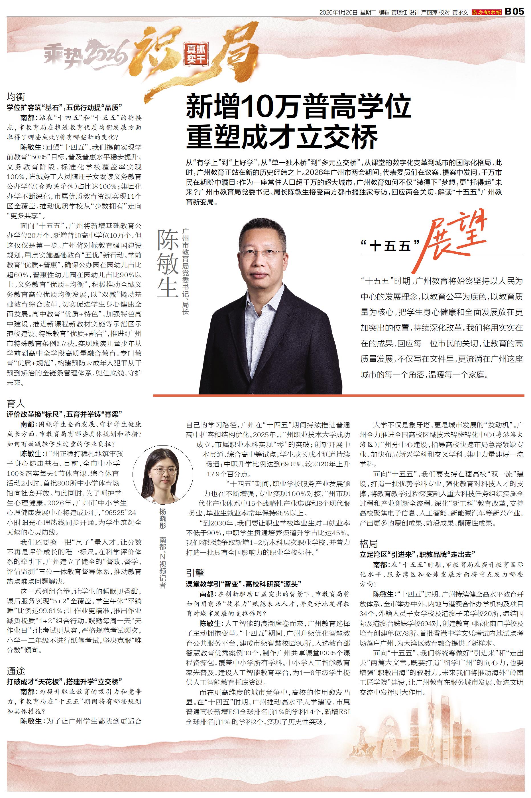 从“有学上”到“上好学”,从“单一独木桥”到“多元立交桥”,从课堂的数字化变革到城市的国际化格局,此时,广州教育正站在新的历史经纬之上。2026年广州市两会期间,代表委员们在议案、提案中发问,千万