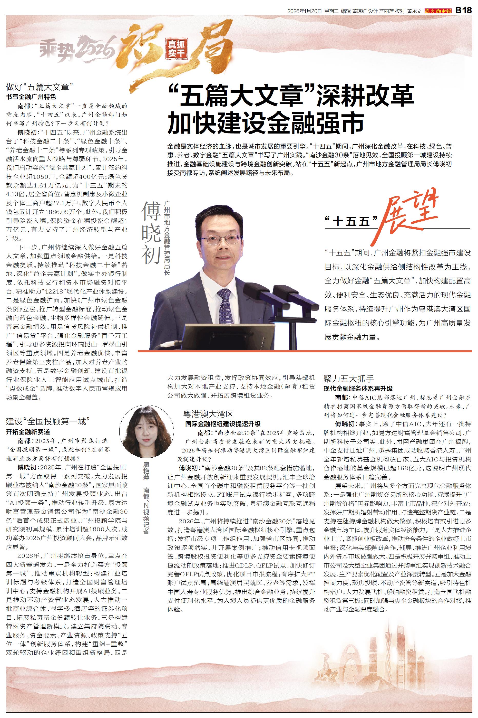 金融是实体经济的血脉,也是城市发展的重要引擎。“十四五”期间,广州深化金融改革,在科技、绿色、普惠、养老、数字金融“五篇大文章”书写了广州实践。“南沙金融30条”落地见效,全国投顾第一城建设持续推