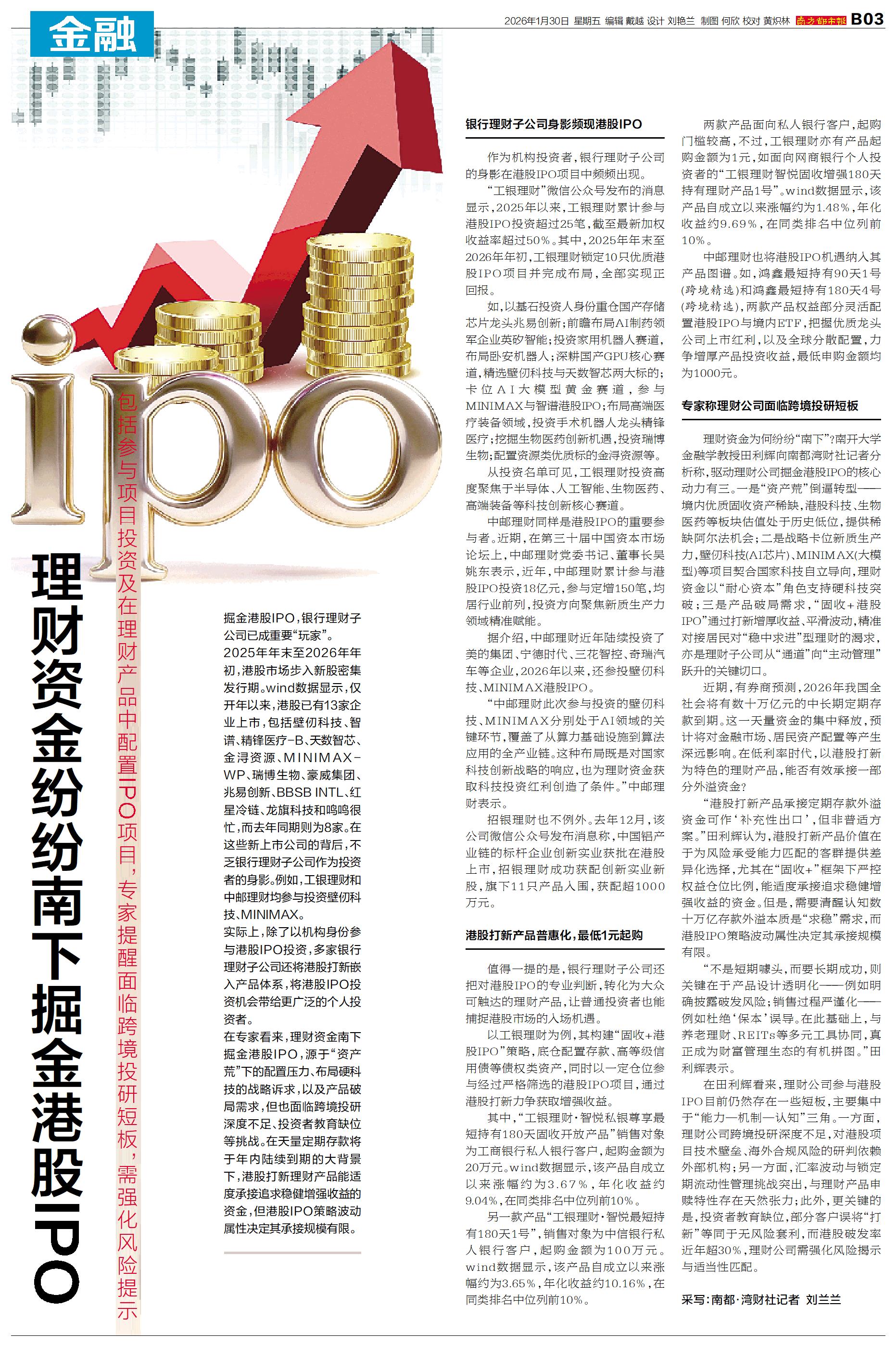 掘金港股IPO,银行理财子公司已成重要“玩家”。 2025年年末至2026年年初,港股市场步入新股密集发行期。wind数据显示,仅开年以来,港股已有13家企业上市,包括