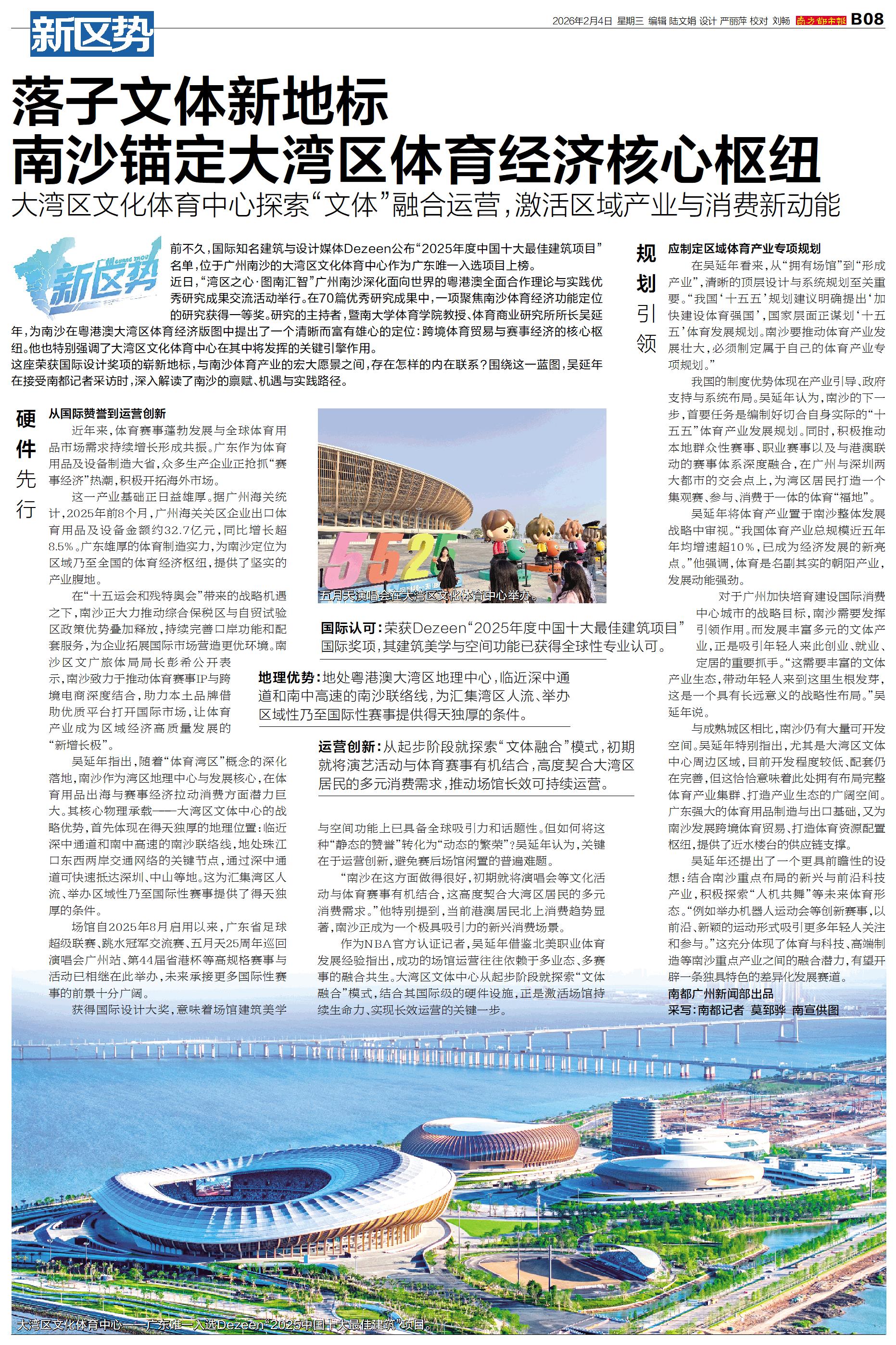 前不久,国际知名建筑与设计媒体Dezeen公布“2025年度中国十大最佳建筑项目”名单,位于广州南沙的大湾区文化体育中心作为广东唯一入选项目上榜。 近日,“湾区之心·图南汇智”广州南沙深化面向世
