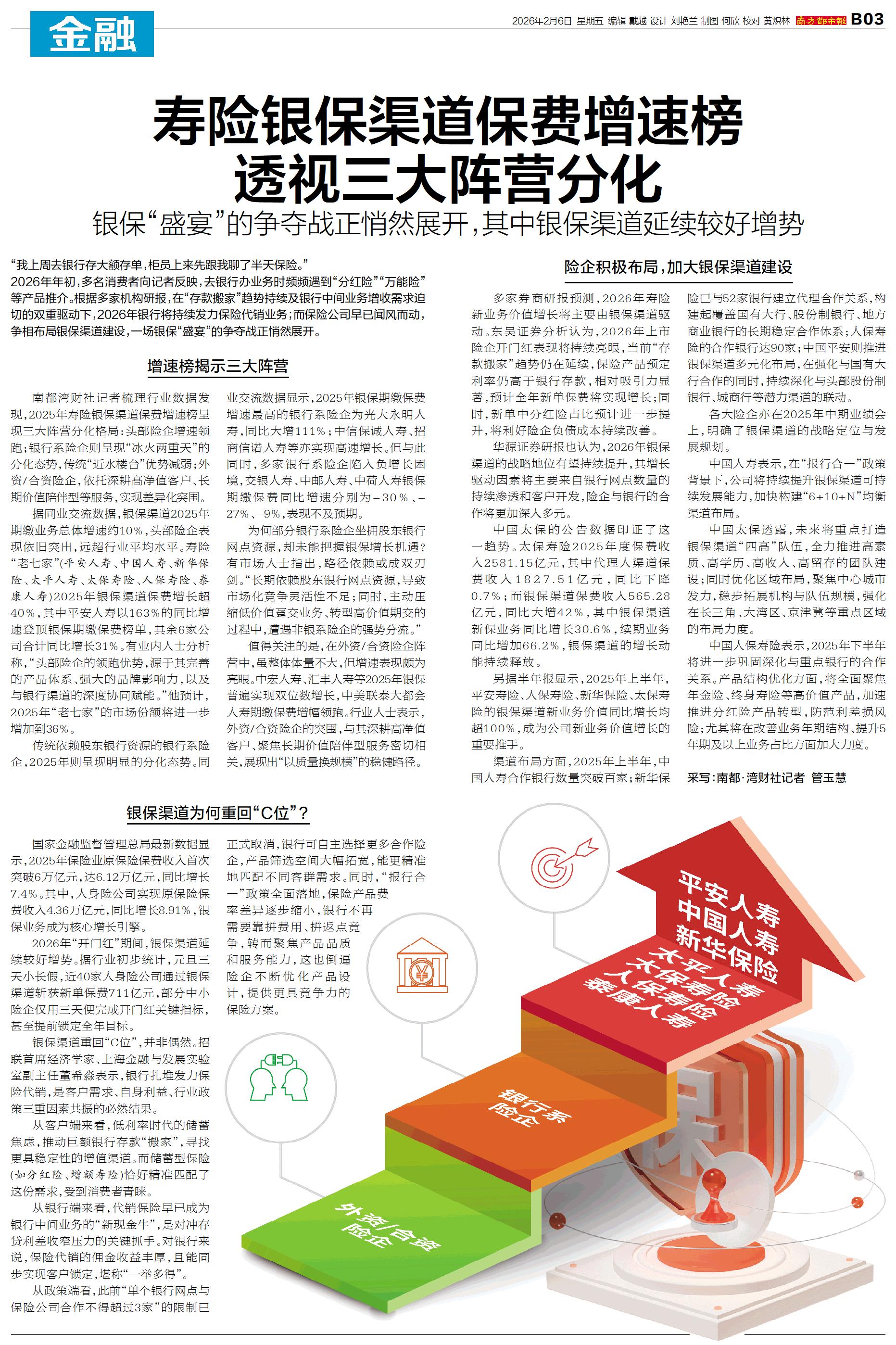“我上周去银行存大额存单,柜员上来先跟我聊了半天保险。” 2026年年初,多名消费者向记者反映,去银行办业务时频频遇到“分红险”“万能险”等产品推介。根据多家机构研报,在“存款搬家”趋势持续及银