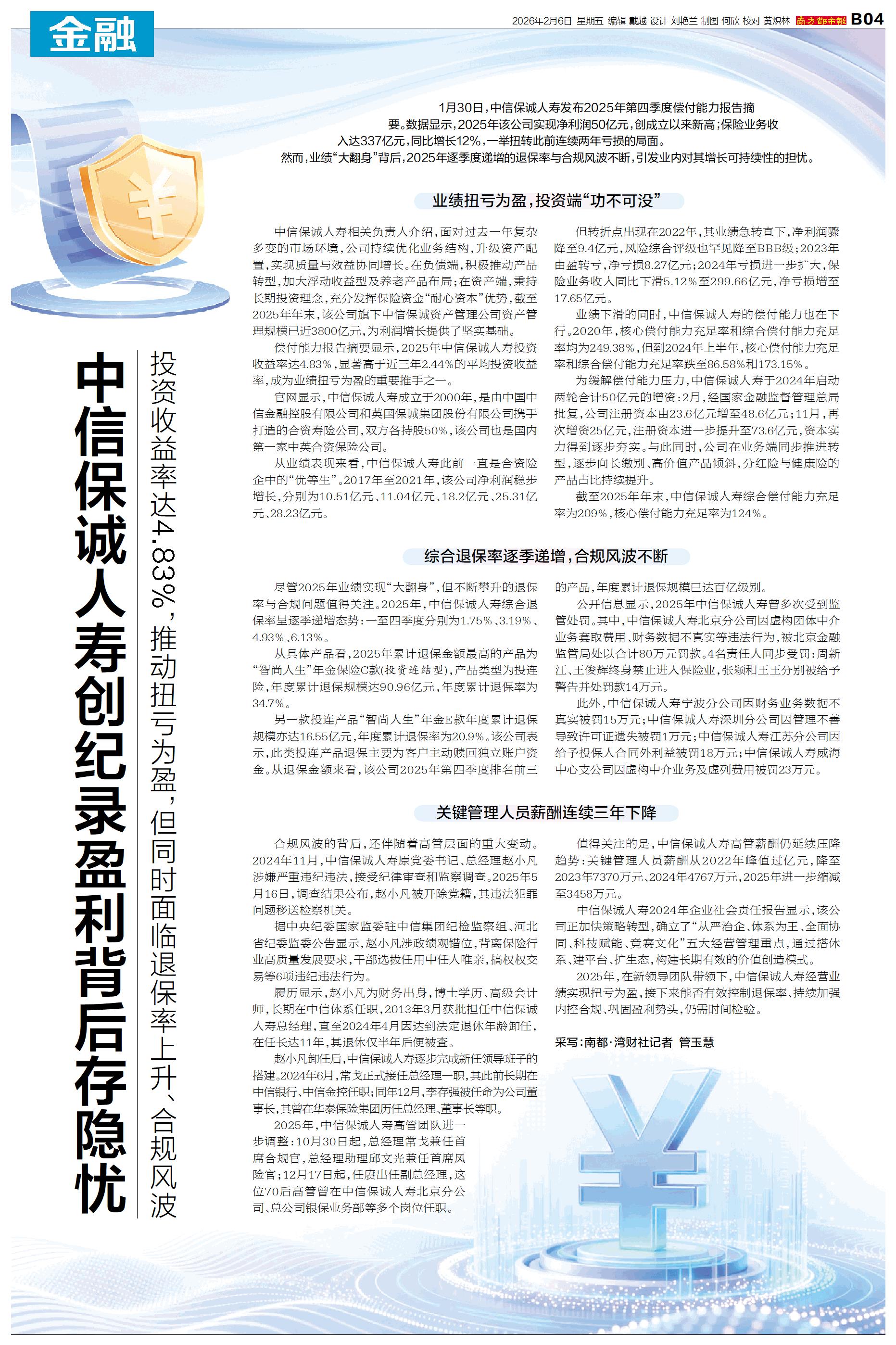 1月30日,中信保诚人寿发布2025年第四季度偿付能力报告摘要。数据显示,2025年该公司实现净利润50亿元,创成立以来新高;保险业务收入达337亿元,同比增长12%,一举扭转此前连续两年亏损的局