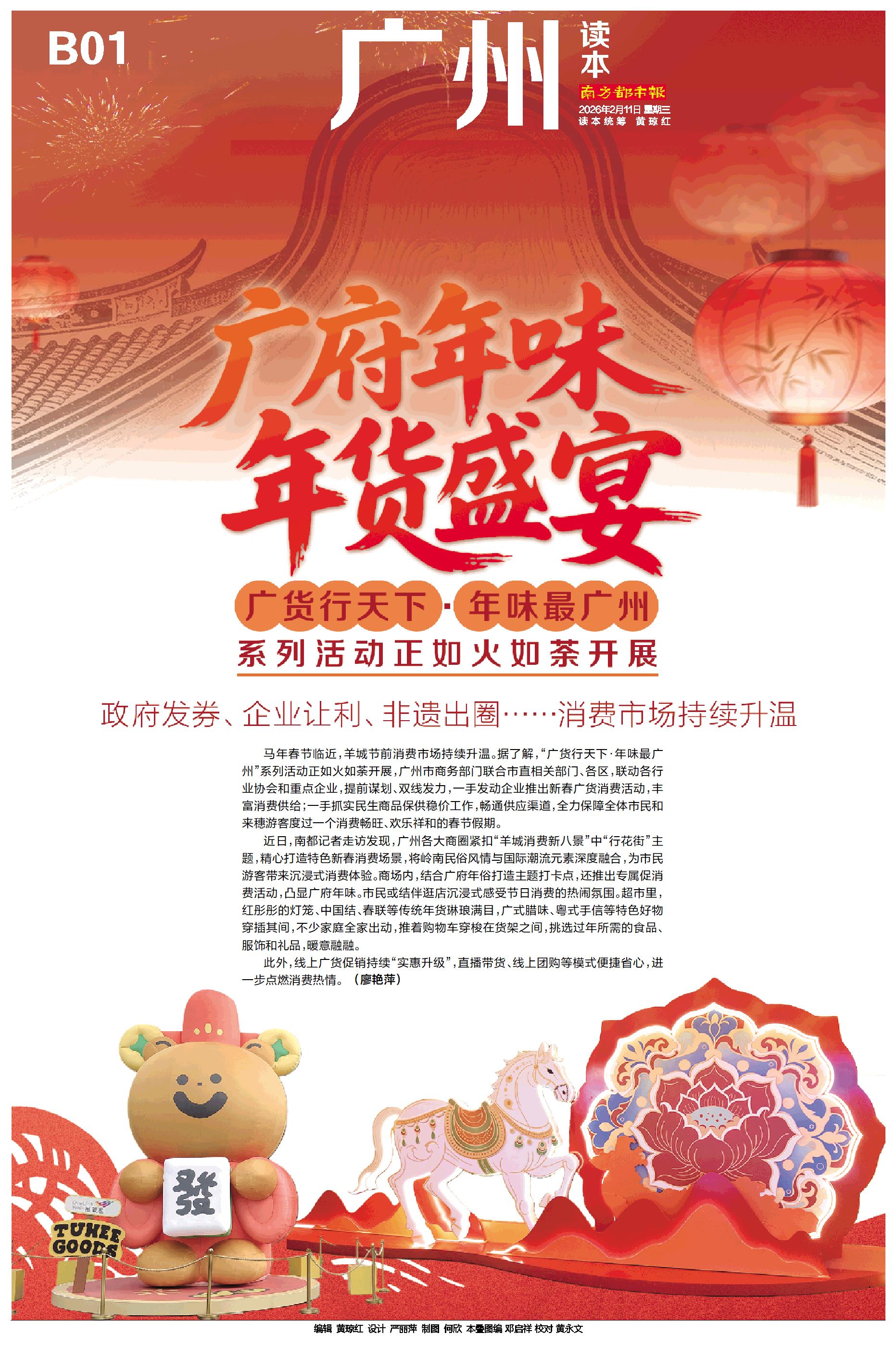 马年春节临近,羊城节前消费市场持续升温。据了解,“广货行天下·年味最广州”系列活动正如火如荼开展,广州市商务部门联合市直相关部门、各区,联动各行业协会和重点企业,提前谋划、双线发力,一手发动企业推