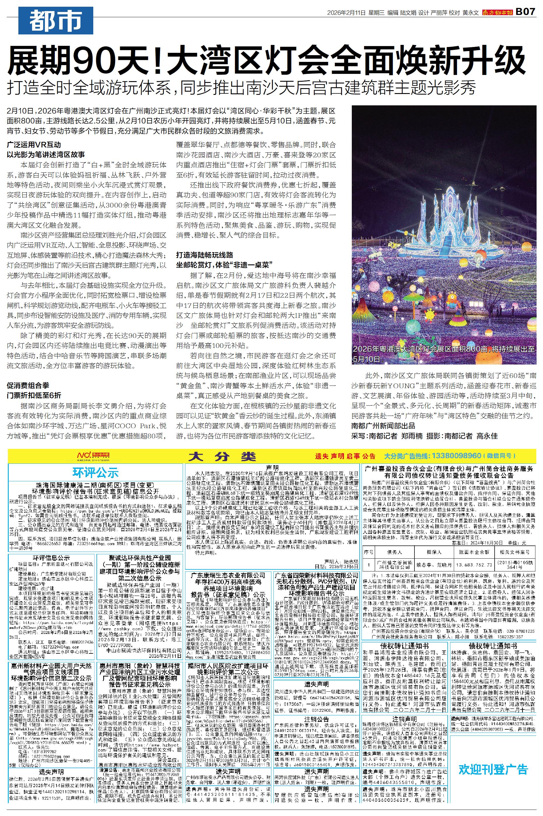 2月10日,2026年粤港澳大湾区灯会在广州南沙正式亮灯!本届灯会以“湾区同心·华彩千秋”为主题,展区面积800亩,主游线路长达2.5公里,从2月10日农历小年开园亮灯,并将持续展出至5月10日,