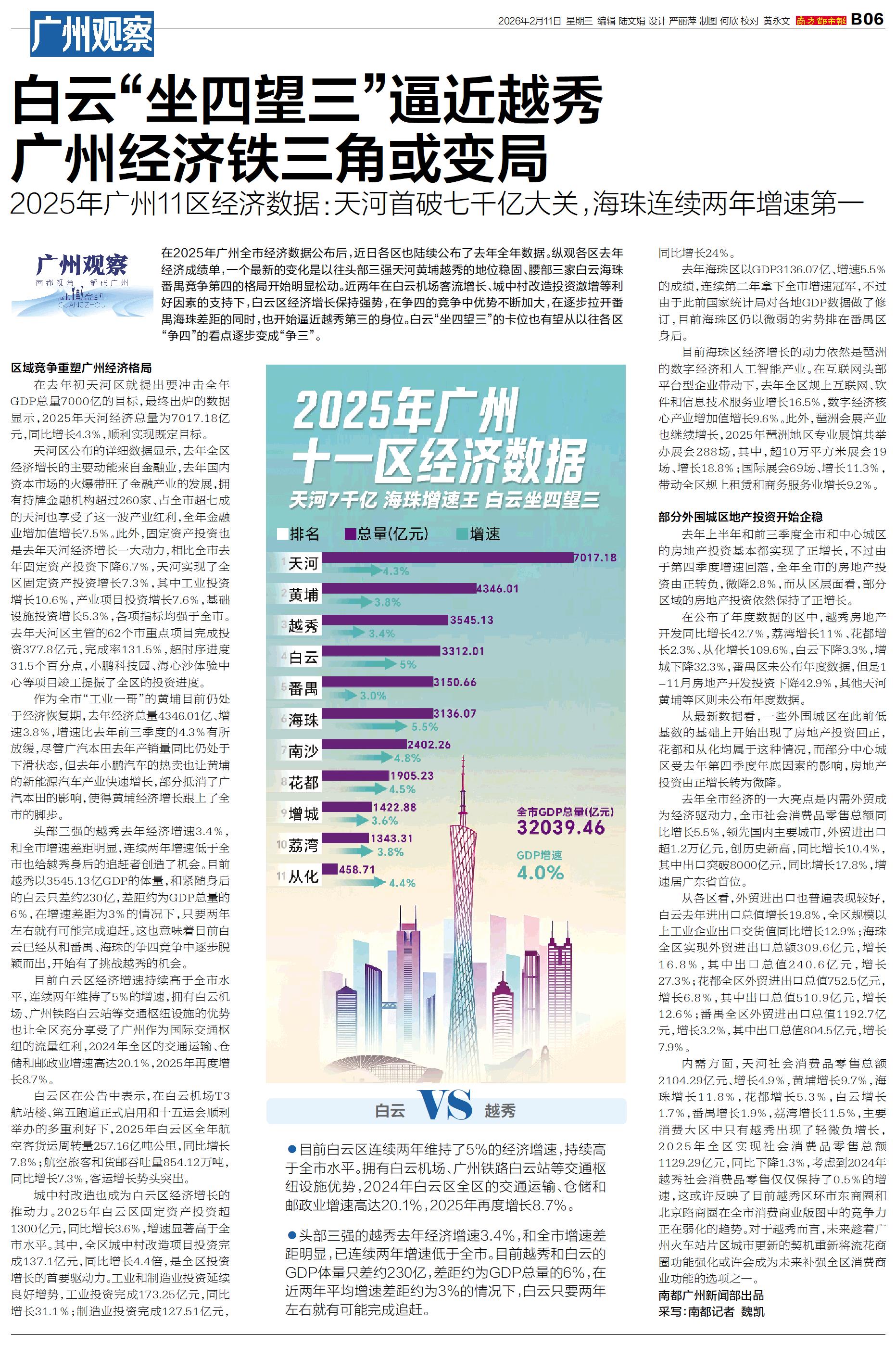 在2025年广州全市经济数据公布后,近日各区也陆续公布了去年全年数据。纵观各区去年经济成绩单,一个最新的变化是以往头部三强天河黄埔越秀的地位稳固、腰部三家白云海珠番禺竞争第四的格局开始明显松动。近