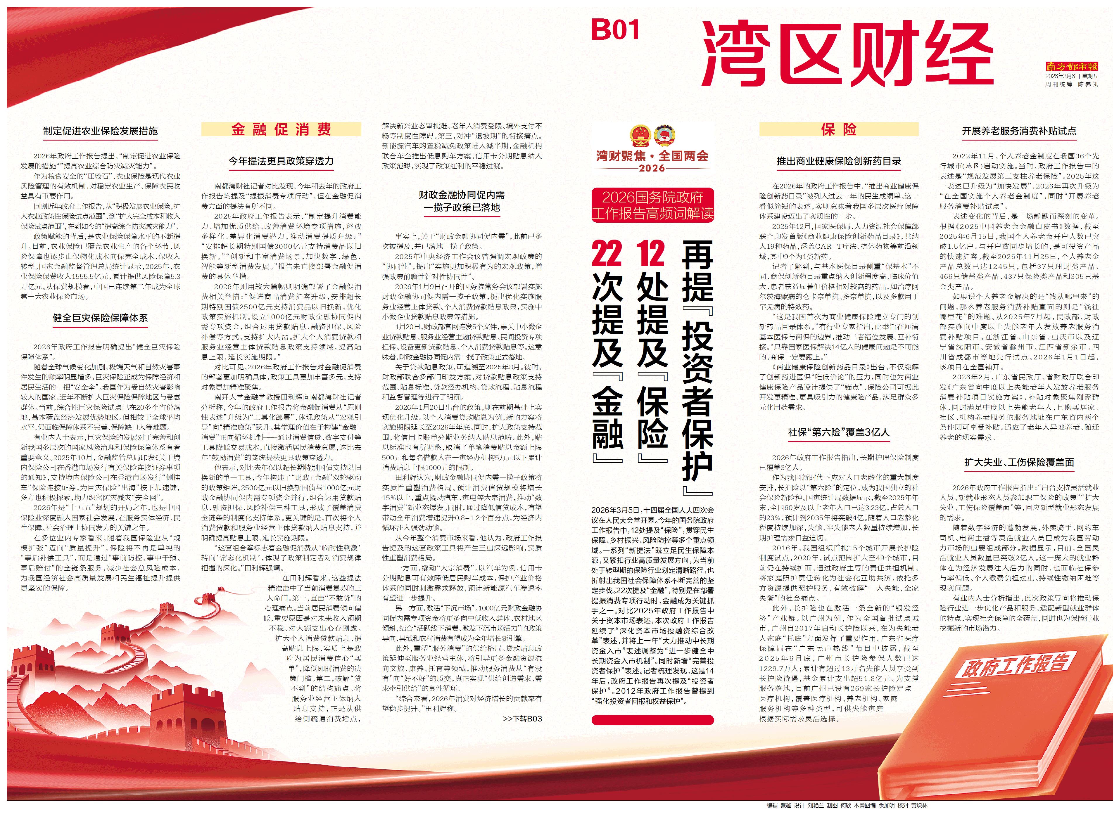 2026年3月5日,十四届全国人大四次会议在人民大会堂开幕。今年的国务院政府工作报告中,12处提及“保险”,贯穿民生保障、乡村振兴、风险防控等多个重点领域。一系列“新提法”既立足民生保障本源,又紧扣行业高质量发展方向,为当前处于转型期的保险行业划定清晰路径,也折射出我国社会保障体系不断完善的坚定步伐。22次提及“金融”,特别是在部署提振消费专项行动时,金融成为关键抓手之一。对比2025年政府工作报告中关于资本市场表述,本次政府工作报告延续了“深化资本市场投融资综合改革”表述,并将上一年“大力推动中长期资金入市”表述调整为“进一步健全中长期资金入市机制”。同时新增“完善投资者保护”表述。记者梳理发现,这是14年后,政府工作报告再次提及“投资者保护”。2012年政府工作报告曾提到“强化投资者回报和权益保护”。