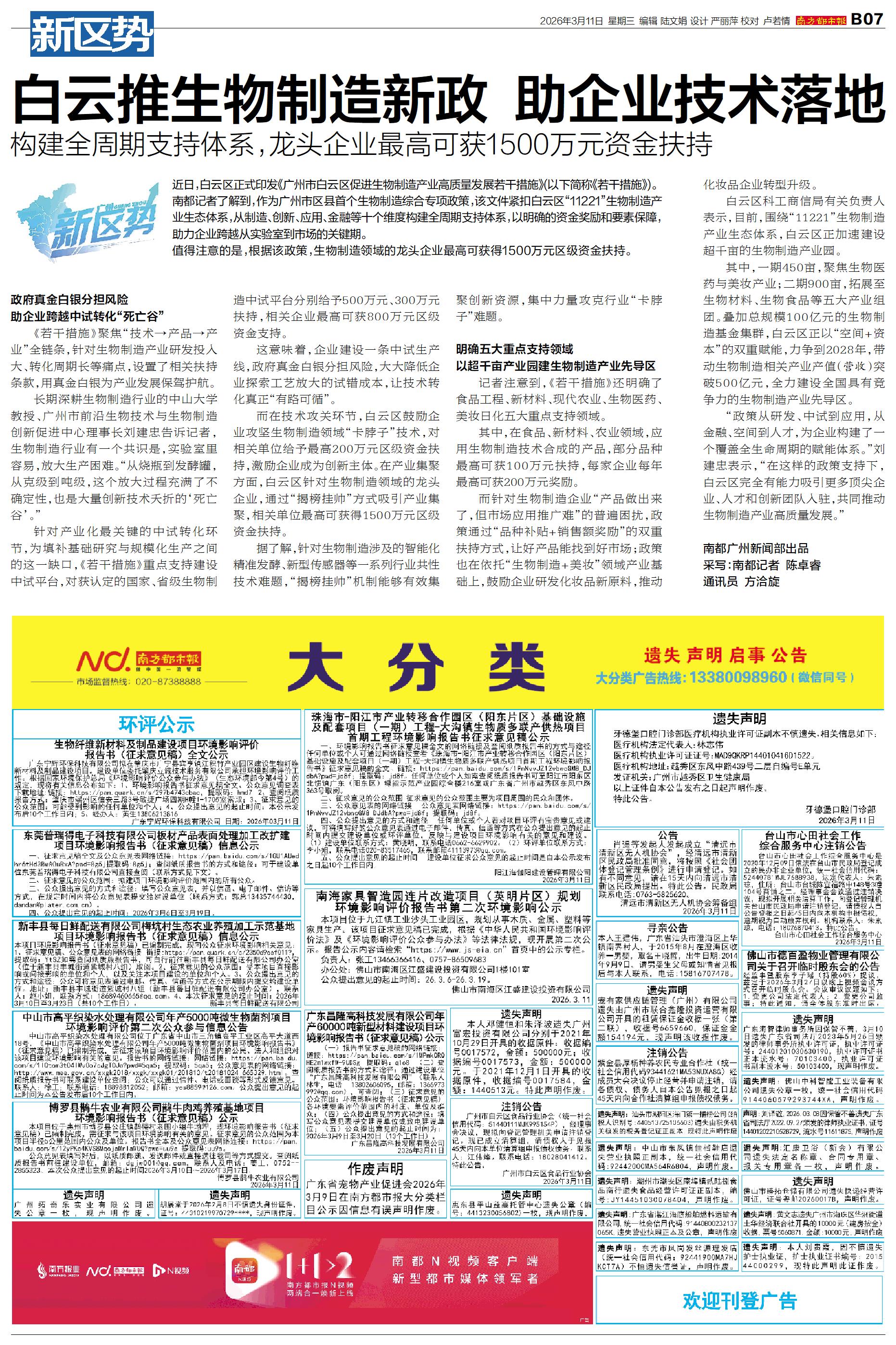 近日,白云区正式印发《广州市白云区促进生物制造产业高质量发展若干措施》(以下简称《若干措施》)。 南都记者了解到,作为广州市区县首个生物制造综合专项政策,该文件紧扣白云区“11221”生物制造产
