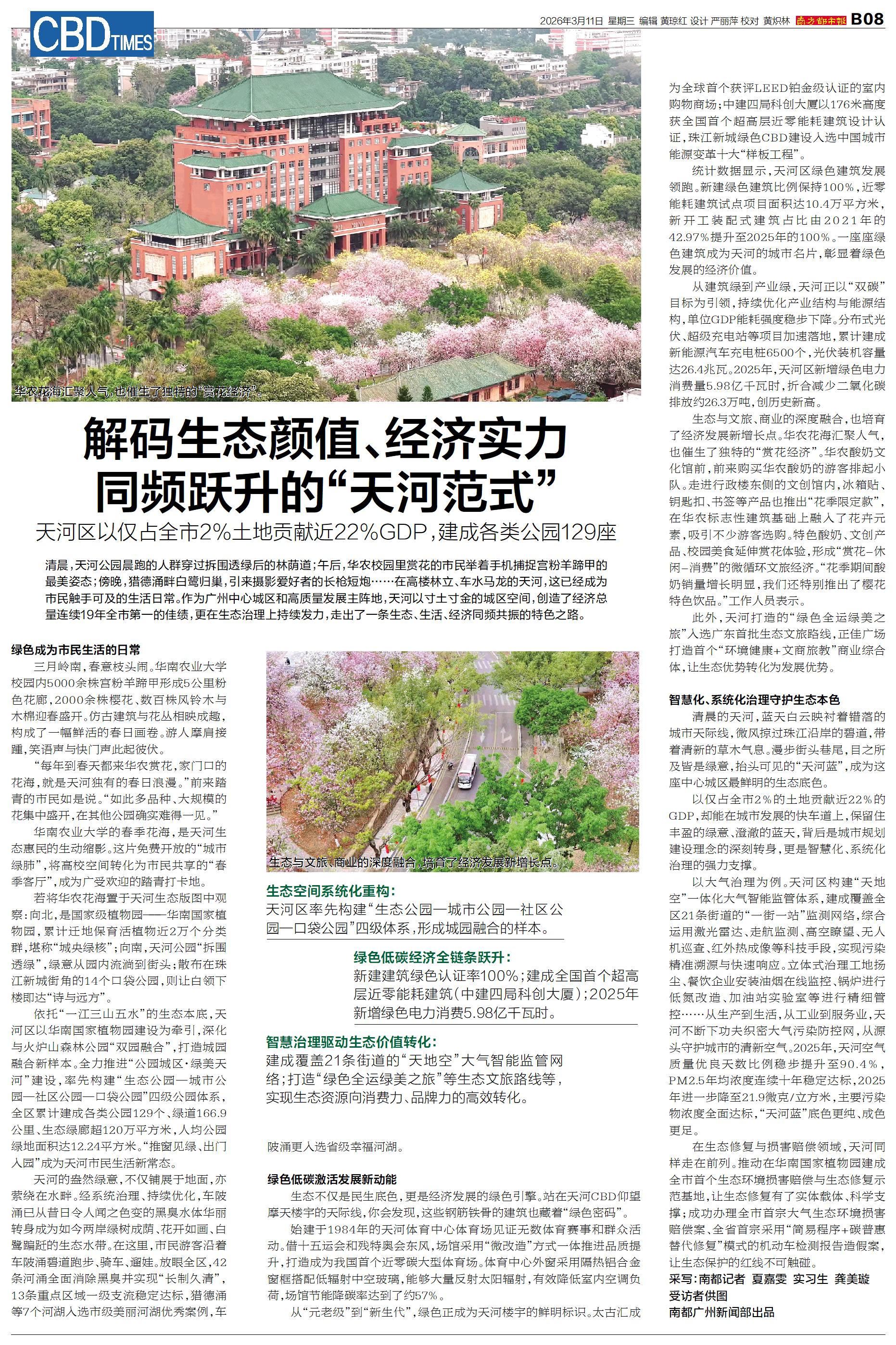 清晨,天河公园晨跑的人群穿过拆围透绿后的林荫道;午后,华农校园里赏花的市民举着手机捕捉宫粉羊蹄甲的最美姿态;傍晚,猎德涌畔白鹭归巢,引来摄影爱好者的长枪短炮……在高楼林立、车水马龙的天河,这已经成