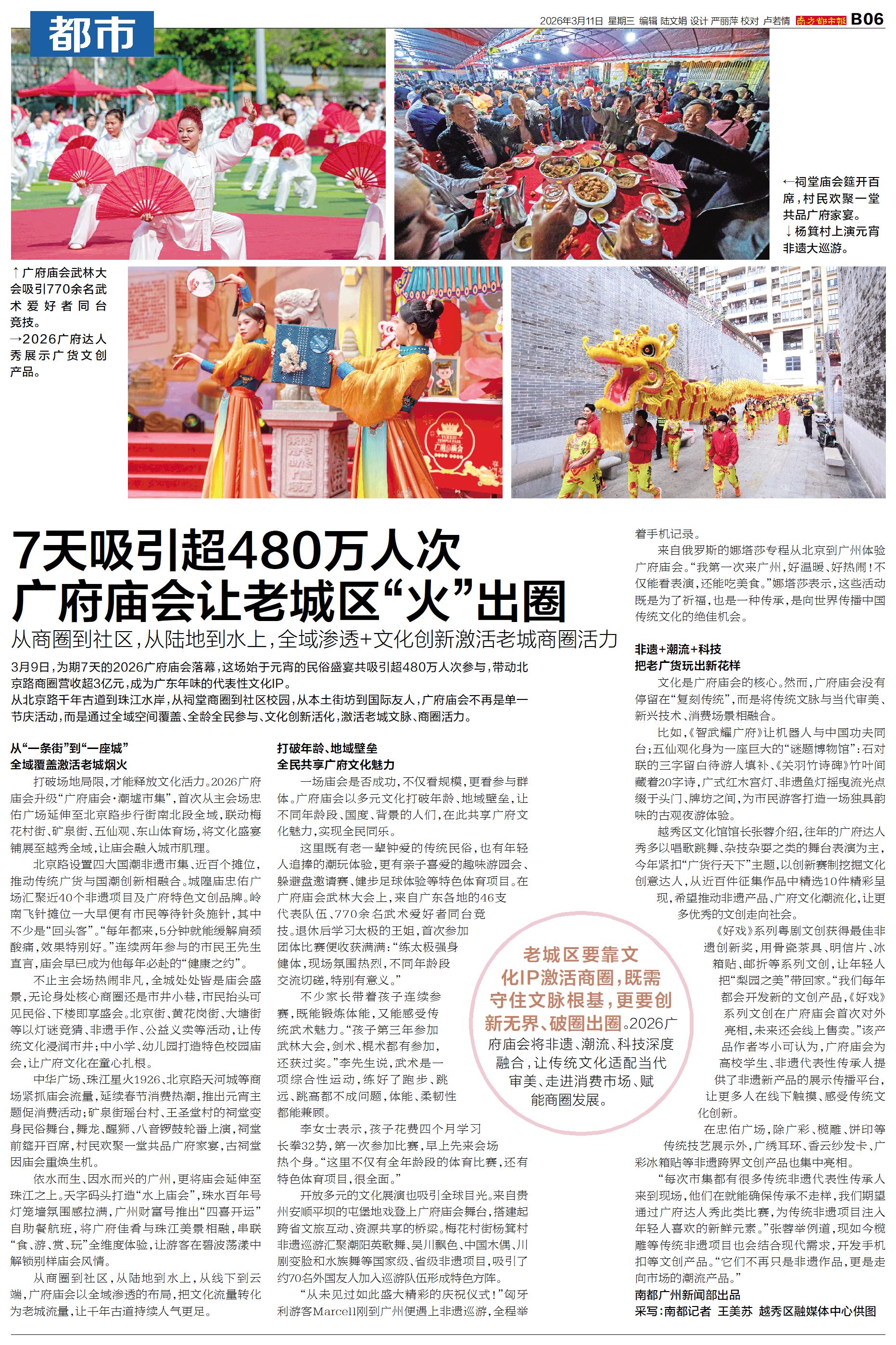 3月9日,为期7天的2026广府庙会落幕,这场始于元宵的民俗盛宴共吸引超480万人次参与,带动北京路商圈营收超3亿元,成为广东年味的代表性文化IP。 从北京路千年古道到珠江水岸,从祠堂商圈到社区