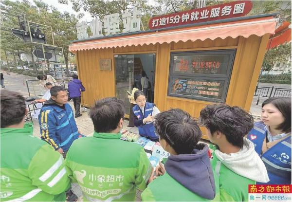 珠海市“香约就业”就业驿站门口,一张小桌子上摆满了宣传册和小礼品,旁边还整整齐齐地堆放着一箱箱矿泉水、零食和常用药品。几位穿着蓝色小马甲的银行工作人员给路人递上宣传单。一名工作人员正指着宣传单上的内容认真地讲解着,几名穿着工服的生鲜超市配送员围在小桌子前,听得格外认真。