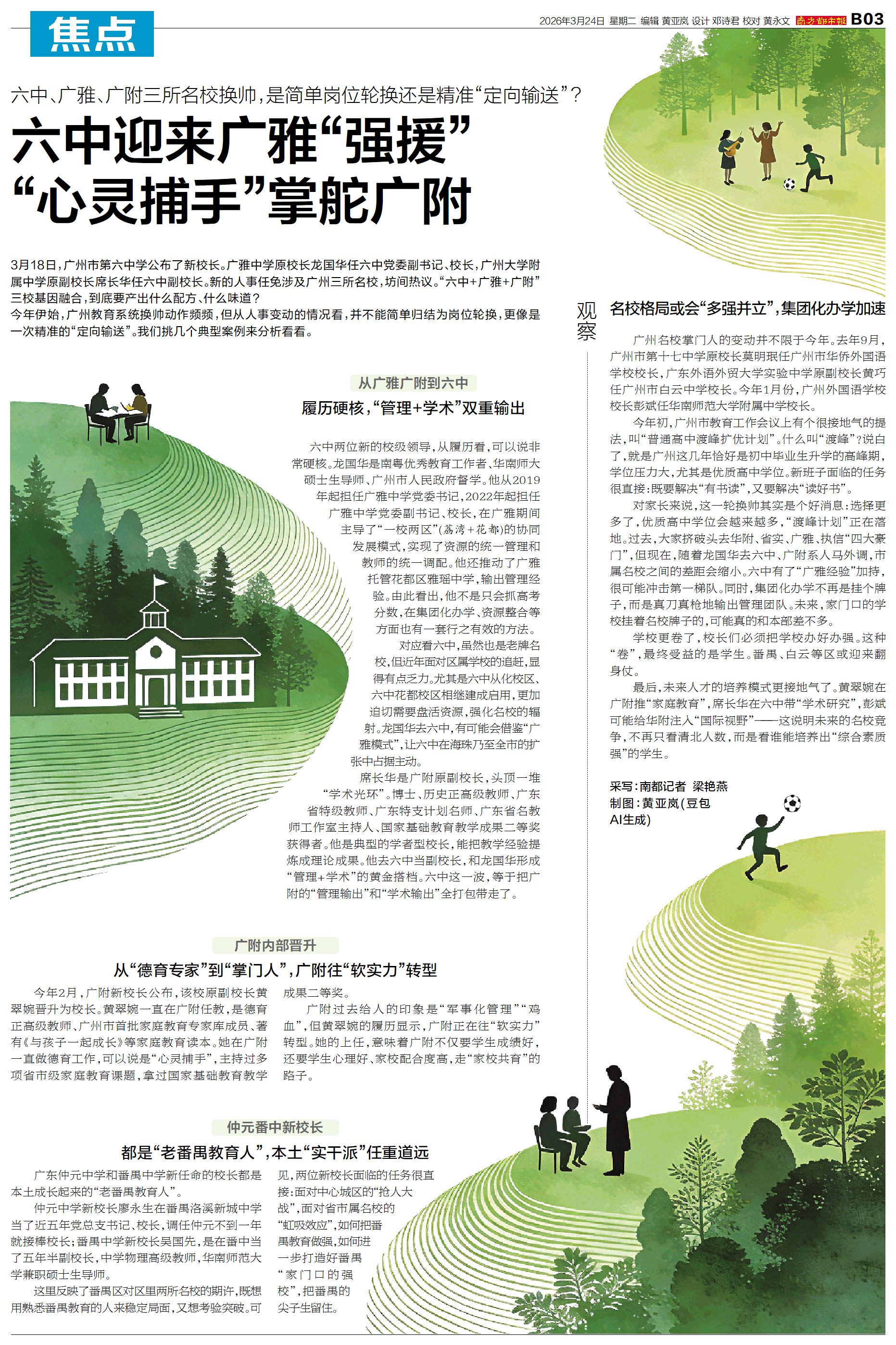 3月18日,广州市第六中学公布了新校长。广雅中学原校长龙国华任六中党委副书记、校长,广州大学附属中学原副校长席长华任六中副校长。新的人事任免涉及广州三所名校,坊间热议。“六中+广雅+广附”三校基因