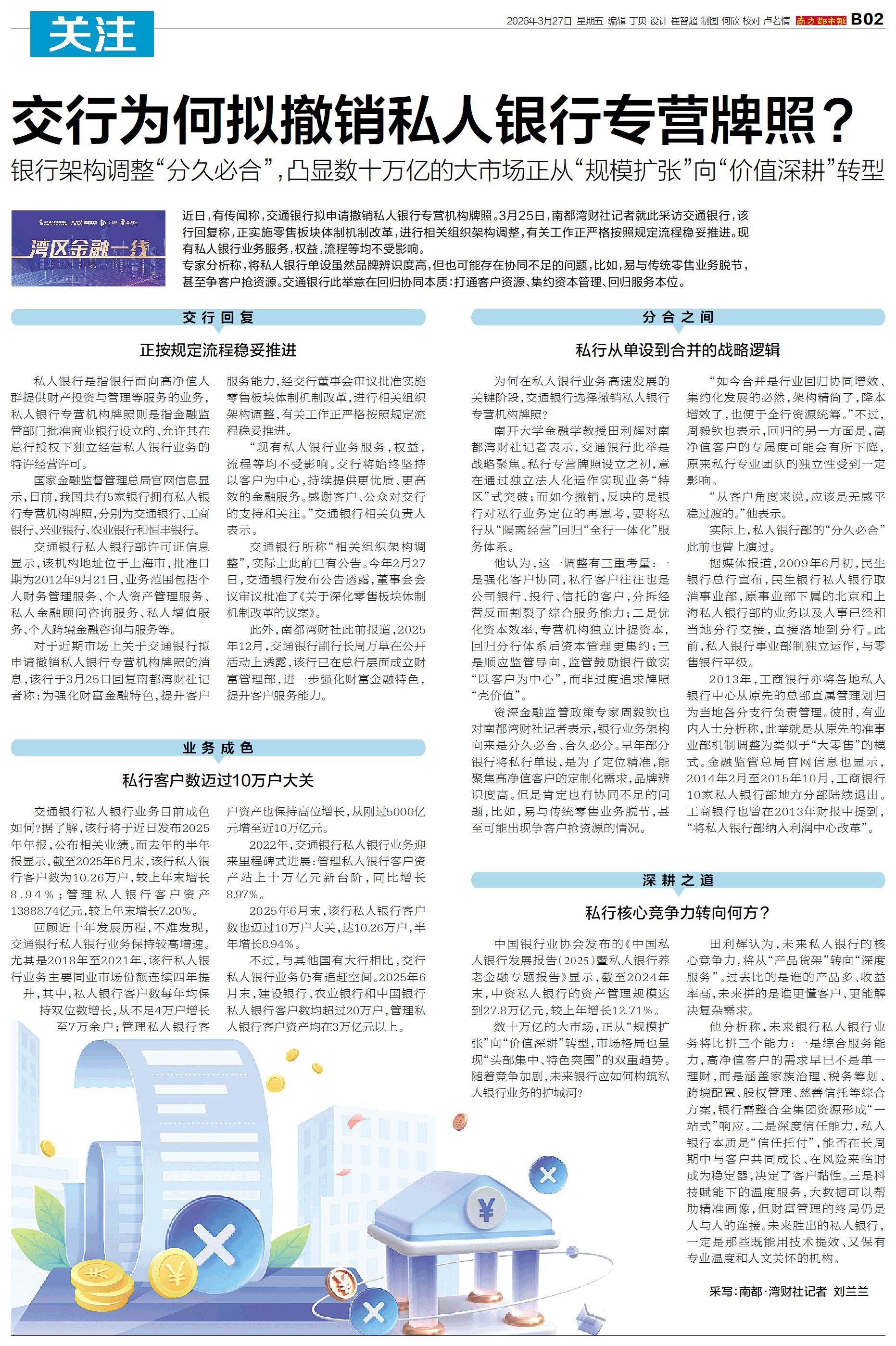 近日,有传闻称,交通银行拟申请撤销私人银行专营机构牌照。3月25日,南都湾财社记者就此采访交通银行,该行回复称,正实施零售板块体制机制改革,进行相关组织架构调整,有关工作正严格按照规定流程稳妥推进