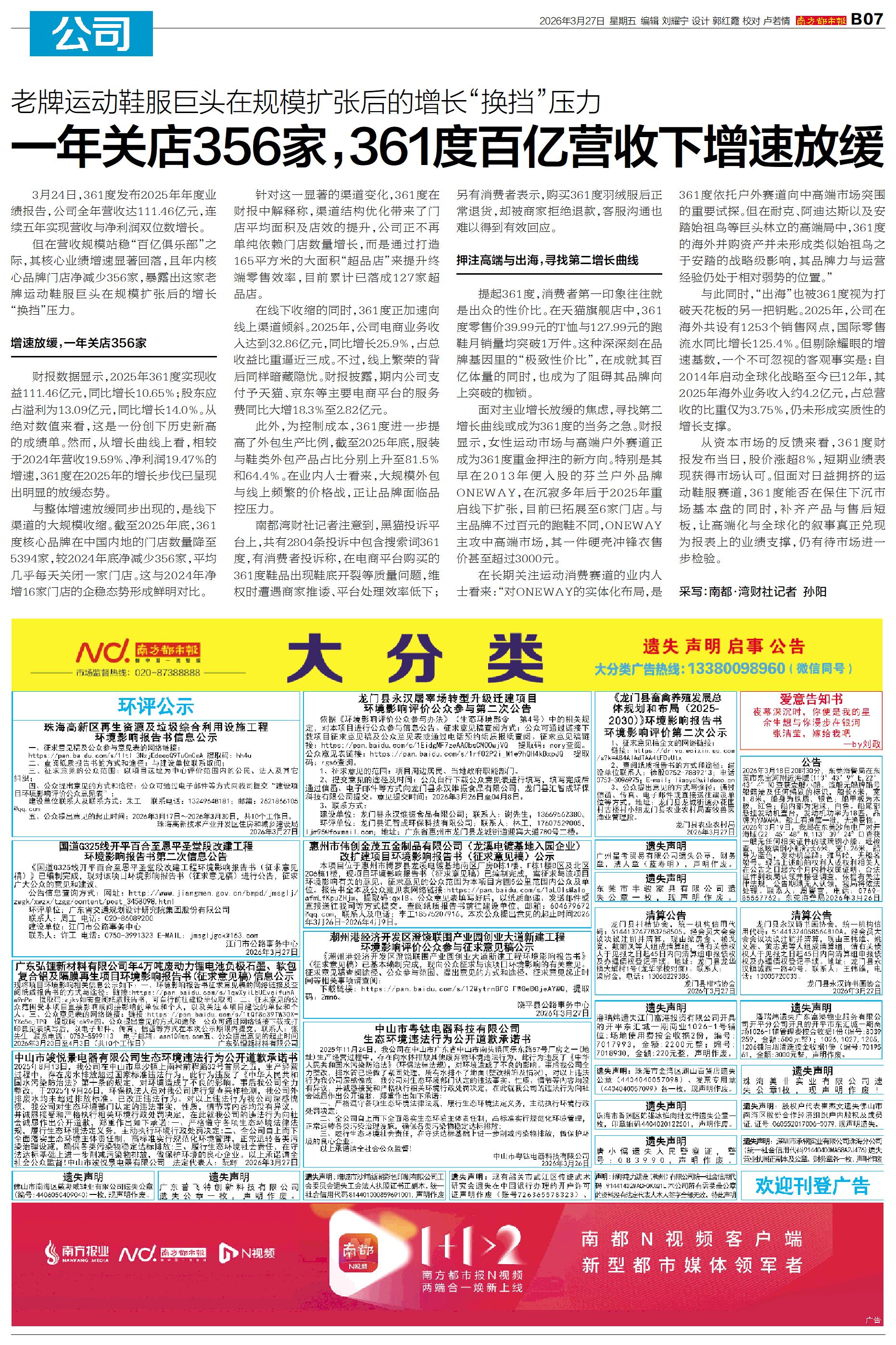 3月24日,361度发布2025年年度业绩报告,公司全年营收达111.46亿元,连续五年实现营收与净利润双位数增长。 但在营收规模站稳“百亿俱乐部”之际,其核心业绩增速显著回落,且年内核心品牌门