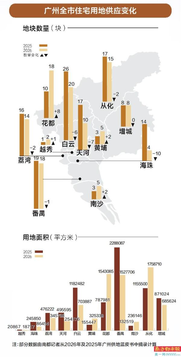 从蓝皮书展示的今年计划供应的居住用地规模看,减量提质成为显著特点,今年计划供应的居住用地119宗,较去年的134宗要少,减量的范围主要集中在中心城区,除了越秀区从去年的1宗增加到今年的2宗、黄埔从3宗增加到5宗之外,其它城区都是地块数量和面积双减:海珠较去年减少了10宗,用地面积从去年的24.5公顷减少至今年的8.6公顷;天河减少了7宗,用地面积从49.5公顷降至25.4公顷;白云减少了6宗,用地面积从118.2公顷降至70.3公顷;荔湾减少了2宗,用地面积从47.6公顷降至34.5公顷。