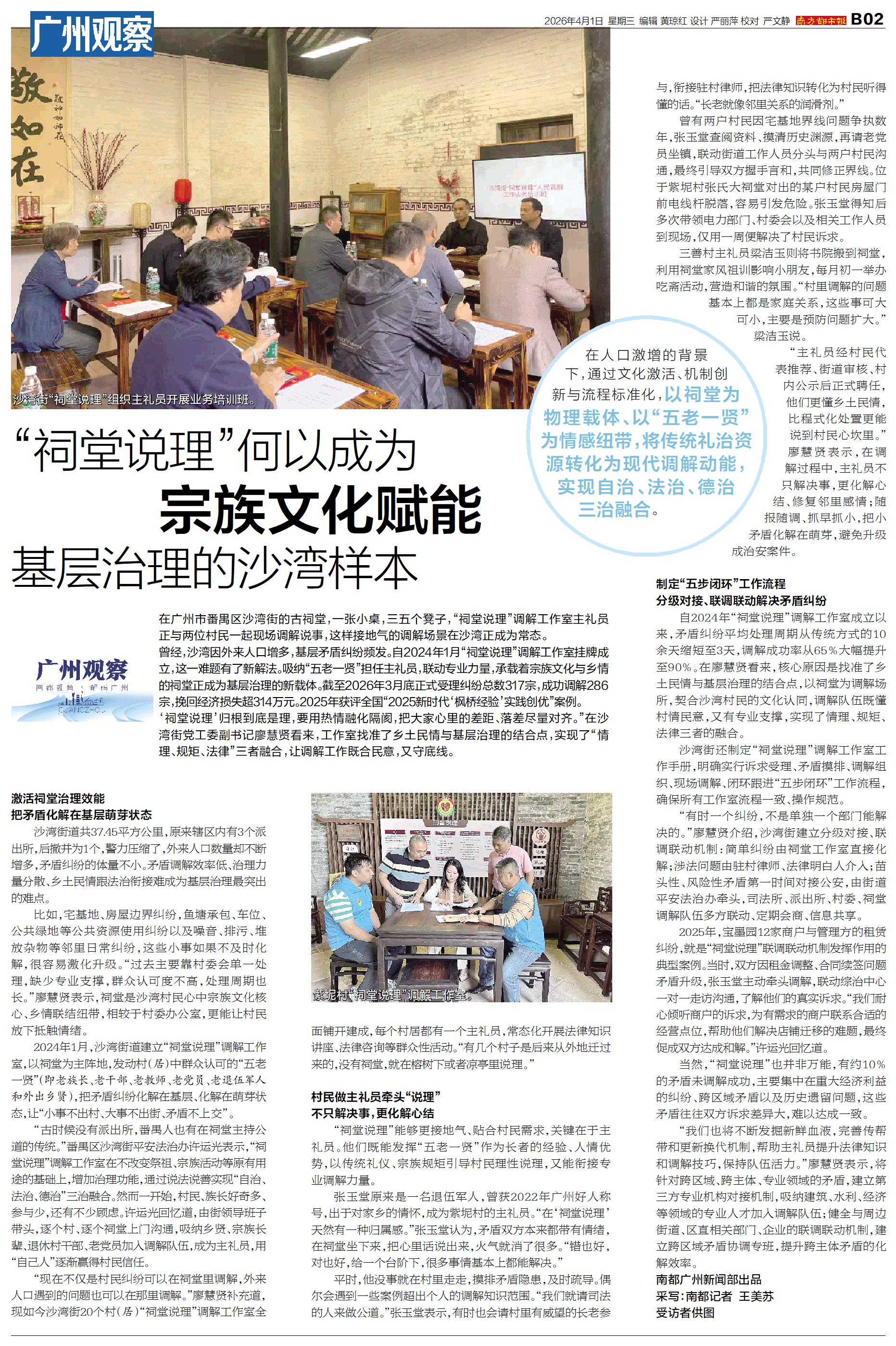 在人口激增的背景下,通过文化激活、机制创新与流程标准化,以祠堂为物理载体、以“五老一贤”为情感纽带,将传统礼治资源转化为现代调解动能,实现自治、法治、德治三治融合。 在广州市番禺区沙湾街的古祠堂