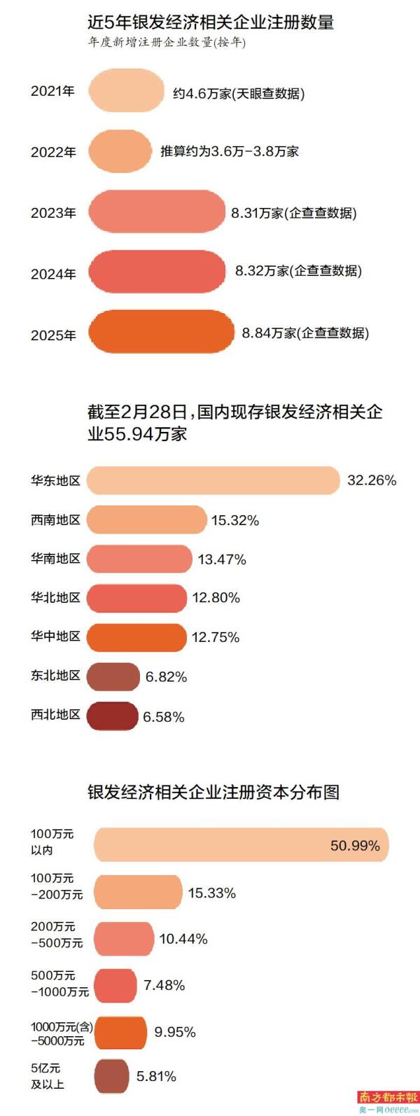 天眼查数据显示,截至目前我国现存在业、存续状态的银发经济相关企业超41.6万家。其中,2025年新增注册相关企业约7.7万余家,从企业注册数量趋势来看,近五年间,银发经济相关企业的注册数量呈现出逐年增长的态势,并在2025年达到顶峰。