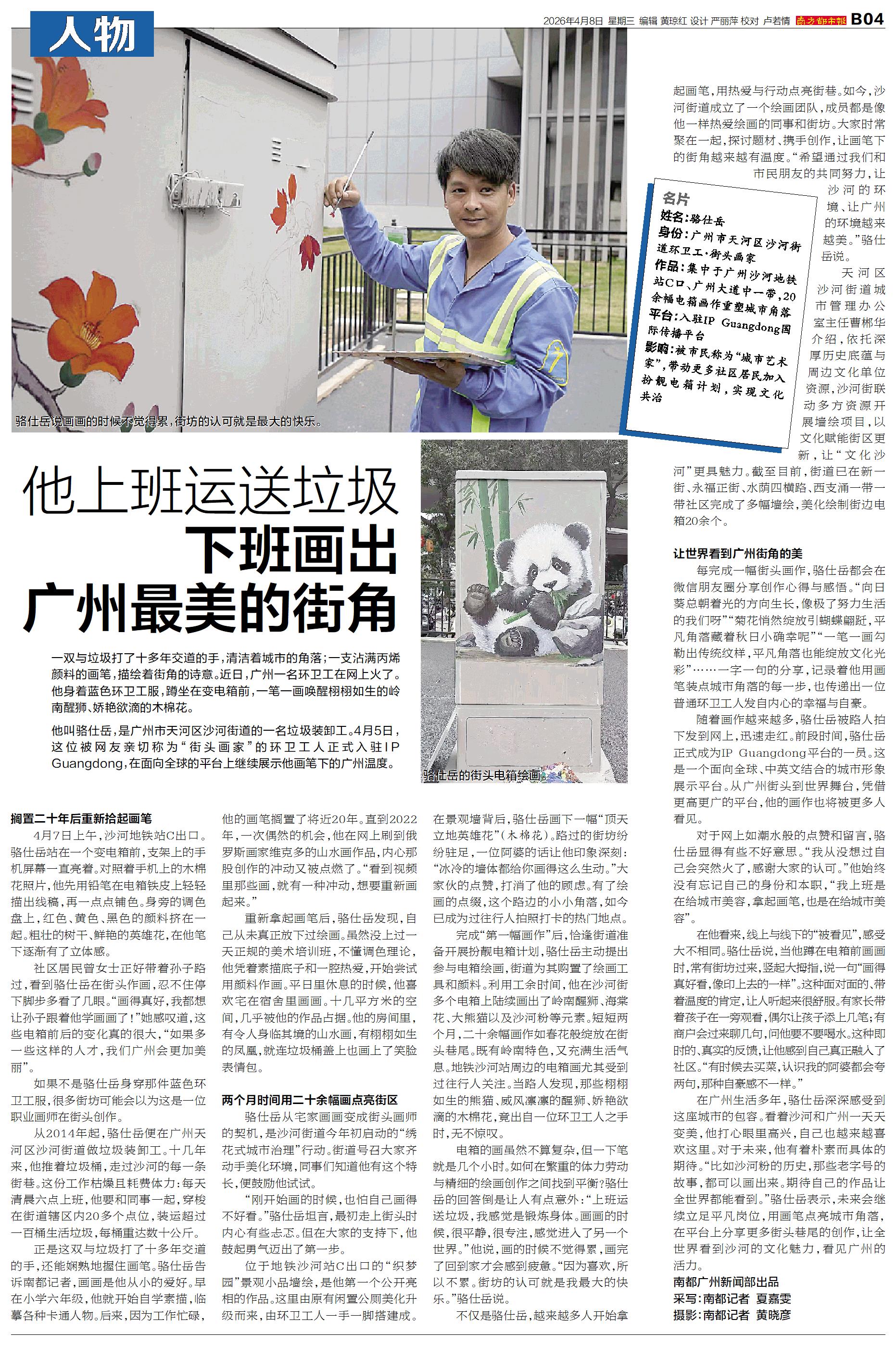 名片 姓名:骆仕岳 身份:广州市天河区沙河街道环卫工·街头画家 作品:集中于广州沙河地铁站C口、广州大道中一带,20余幅电箱画作重塑城市角落 平台:入驻IP Guangdong国际传播平台